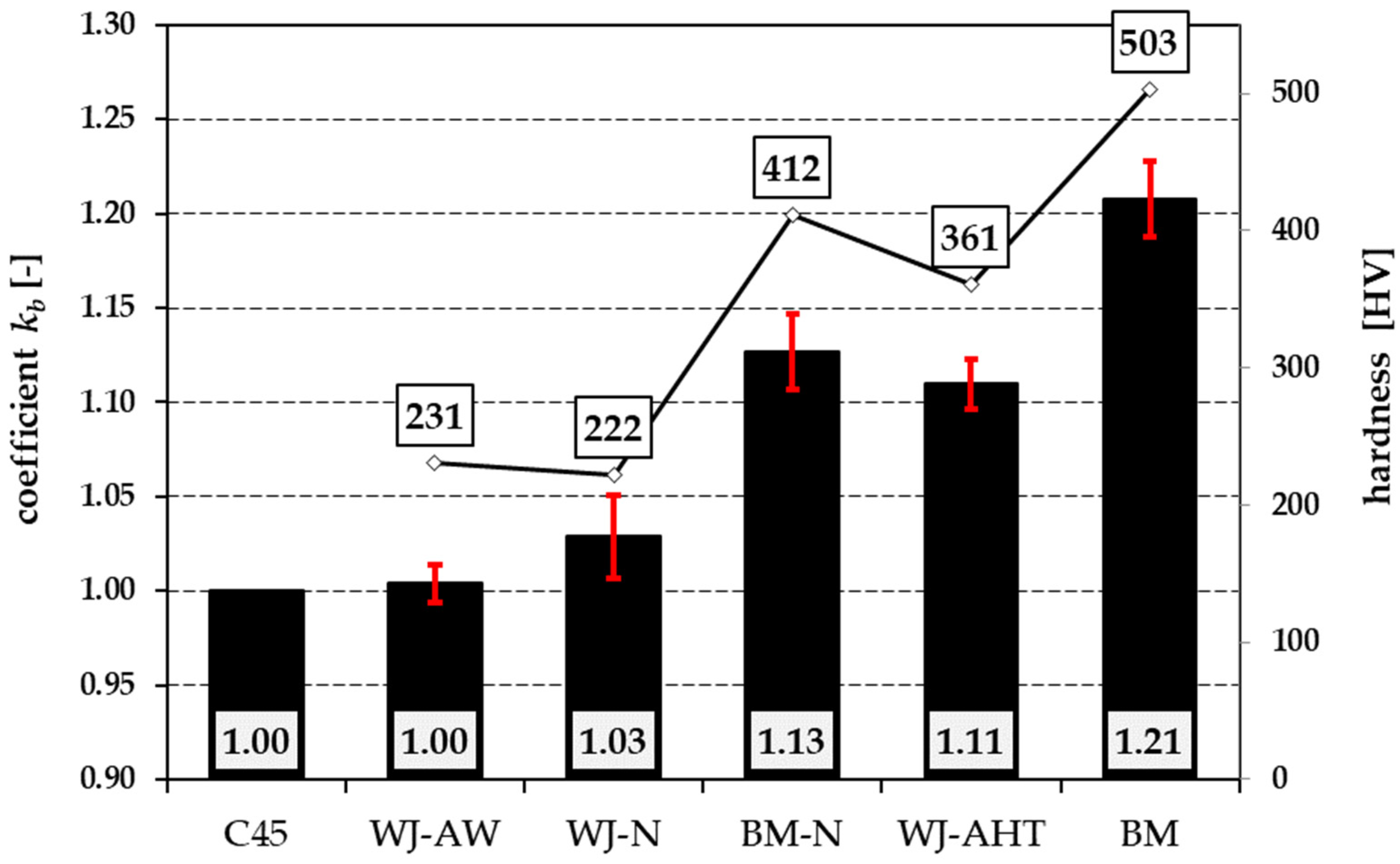 - After the application of comprehensive post-weld heat treatment, a uniform martensitic microstructure was obtained throughout all zones of the joint, with fresh martensite observed in the weld metal. The hardness of the weld metal increased to 370–390 HV, while the base material retained its original hardness of 503 HV. The abrasive wear resistance coefficient reached kb = 1.08 ± 0.01, representing an improvement of approximately 55% compared to the as-welded state.