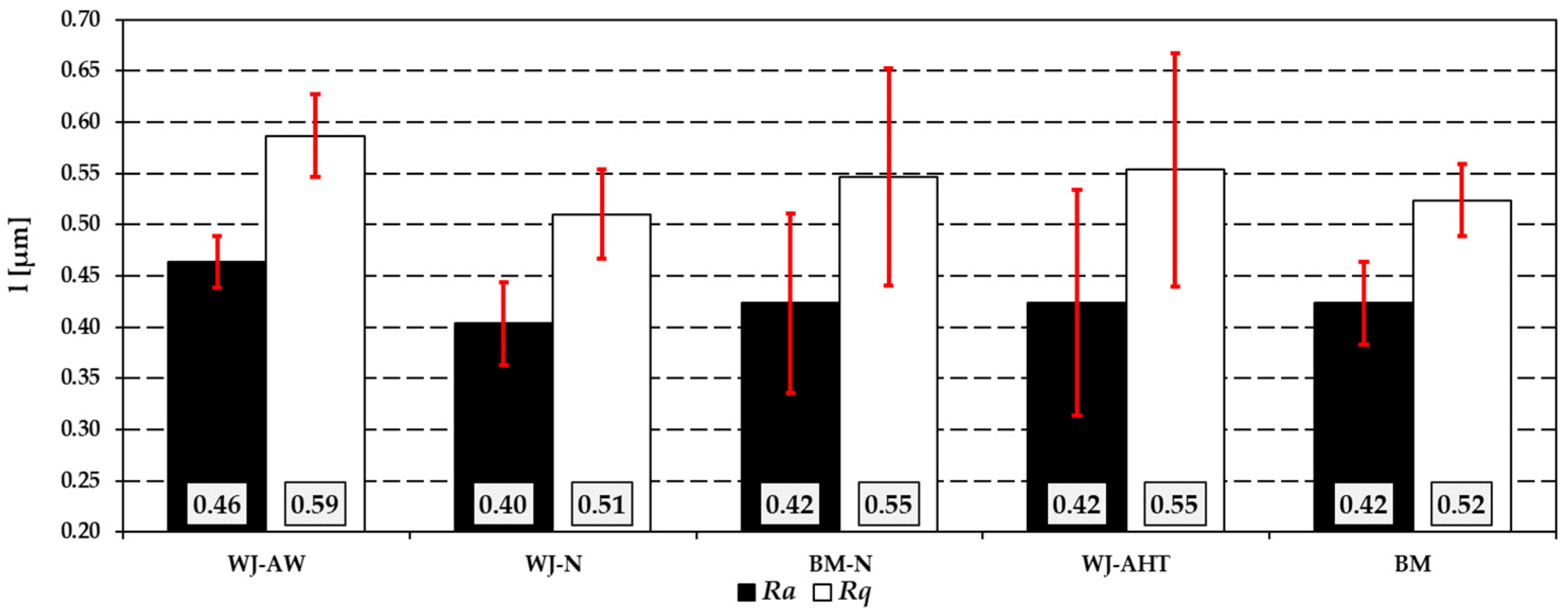 - The roughness parameter analysis confirmed a distinct differentiation of surface topography depending on the applied heat treatment condition. The highest values of all evaluated parameters were recorded for the as-welded joint, resulting from the presence of deep cavities and pits caused by the intensive penetration of abrasive particles. The application of post-weld heat treatment led to a clear surface smoothing effect, as reflected by the reduction in the ratio of depth-related parameters. Among the analyzed parameters, Ra and Rq demonstrated the strongest correlation with abrasive wear resistance, indicating their high prognostic relevance.