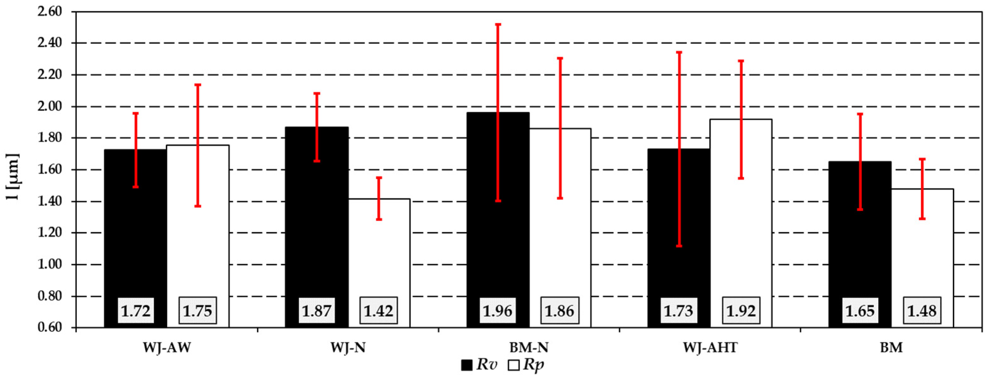 - Depth-related parameters, particularly their mutual relationship, can serve as sensitive indicators of the prevailing wear micromechanisms and the tribological response of materials. The analysis of the Rv/Rp ratio revealed that in the normalized state, wear processes are dominated by the formation of deep pits (Rv/Rp > 1), while after the post-weld heat treatment, their occurrence is significantly reduced, with wear mechanisms shifting towards microplowing and microscratching (Rv/Rp < 1).