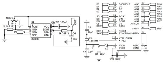 In the data acquisition circuit, the output voltage signal from the detector in the photoelectric detection module is conditioned by an LM358 operational amplifier. The conditioned analog signal is then converted into a digital signal by an ADS1256 chip and subsequently transmitted to the microcontroller unit, as illustrated in Figure 6. The constant-current drive circuit is designed to supply a stable current to the LEDs serving as light sources, ensuring consistent luminous intensity and long-term stability.