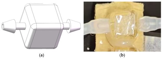 The design and implementation of the integrated gas-trapping cavity: (a) A schematic model of the cubic glass cavity, showing the horizontal flow path between the inlet (left) and outlet (right). The cubic internal volume measures 1.5 mL. (b) Photograph of the fabricated cavity integrated into the flow system.