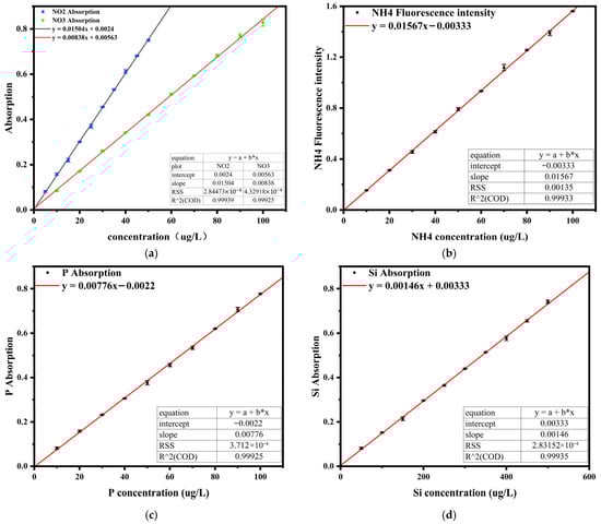 Standard calibration solutions for nitrite, nitrate, ammonium, phosphate, and silicate were prepared separately according to the practical measurement requirements. Standard curves were established by plotting the concentration of each nutrient as the abscissa and the corresponding absorbance or fluorescence intensity as the ordinate. Excellent linear relationships were obtained, as shown in Figure 11. The correlation coefficients (R2) of all standard curves reached or exceeded 0.999, meeting the minimum requirement stipulated in the “The specification for marine monitoring Part 2: Data processing and quality control of analysis” (GB 17378.2-2007) [33].