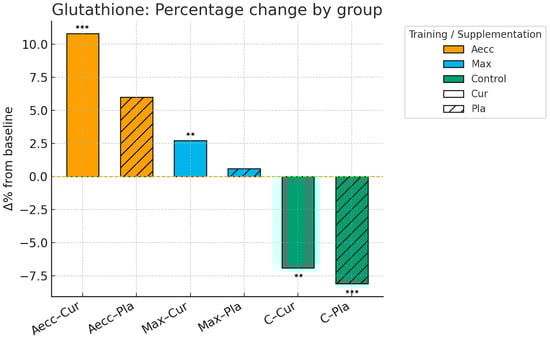 Pre–post percentage change by group in glutathione. Significance markers: ** p < 0.01; *** p < 0.001. Aecc-Cur: elastic band accentuated eccentric training + curcumin supplementation group; Aecc-Pla: elastic band accentuated eccentric training + placebo group; Max-Cur: elastic band maximum strength training + curcumin supplementation group; Max-Pla: elastic band maximum strength training + placebo group; C-Cur: control + curcumin supplementation group; C-Pla: control + placebo group.