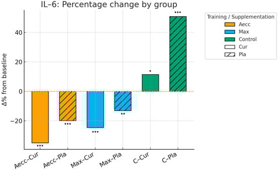 Pre–post percentage change by group in interleukin-6. Significance markers: * p < 0.05; ** p < 0.01; *** p < 0.001. Aecc-Cur: elastic band accentuated eccentric training + curcumin supplementation group; Aecc-Pla: elastic band accentuated eccentric training + placebo group; Max-Cur: elastic band maximum strength training + curcumin supplementation group; Max-Pla: elastic band maximum strength training + placebo group; C-Cur: control + curcumin supplementation group; C-Pla: control + placebo group.
