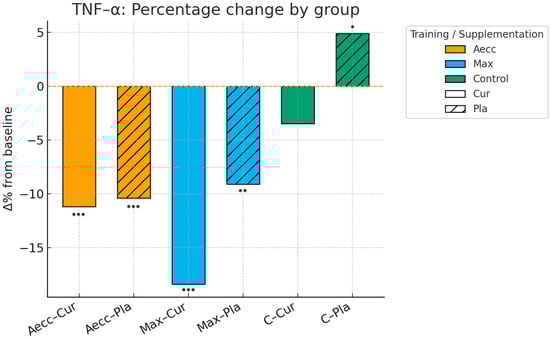 Pre–post percentage change by group in tumor necrosis factor alpha. Significance markers: * p < 0.05; ** p < 0.01; *** p < 0.001. Aecc-Cur: elastic band accentuated eccentric training + curcumin supplementation group; Aecc-Pla: elastic band accentuated eccentric training + placebo group; Max-Cur: elastic band maximum strength training + curcumin supplementation group; Max-Pla: elastic band maximum strength training + placebo group; C-Cur: control + curcumin supplementation group; C-Pla: control + placebo group.