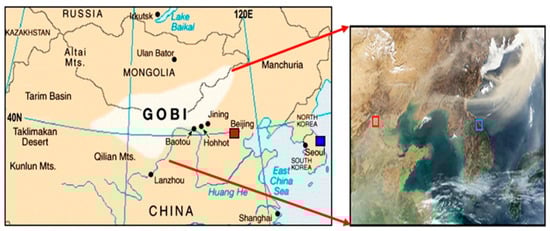 Map of Asia (left: Mongolia, northern China, and Republic of Korea) and satellite dust images (right, thin yellow color). Red and blue squares denote Beijing city (China) and Gangneung city (Republic of Korea). (https://kr.pinterest.com/pin/gobi-desert-map--269371621436682946/ (accessed on 15 January 2024). https://visibleearth.nasa.gov/images/58069/dust-over-korea-and-the-sea-of-japan (accessed on 15 January 2024)).
