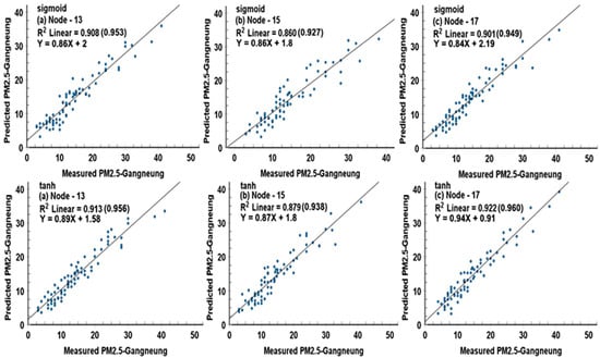 Sequentially, the coefficients of independent variables in 13 and 17 hidden nodes can be obtained in a similar way to the case of 15 nodes, but the calculation formulas were not presented here due to the many similar formulas. Later, output values of PM10-G(F), PM2.5-G(F), and NO2-G(F), scaled between 0 and 1.0 (−1.0 and 1.0) for the ANN-sigmoid (ANN-tanh) using Equation (3) (Equation (4)), must be transformed into the original state for actual predicted values.