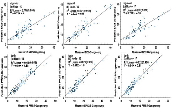 Among training, testing, and validation, evaluated by the ANN-sigmoid and ANN-tanh model, validation is the most important to assess their prediction abilities. Even though two models show very high prediction accuracy, the ANN-tanh model shows a better prediction ability of over 0.938 of Pearson R with the 17 node numbers (except for oppositely lowest 0.886 in 15 nodes of NO2), rather than the ANN-sigmoid model. In the ANN-sigmoid model, the R values are similar and higher in the 13 and 17 nodes than 15 nodes, except for oppositely lower for NO2.