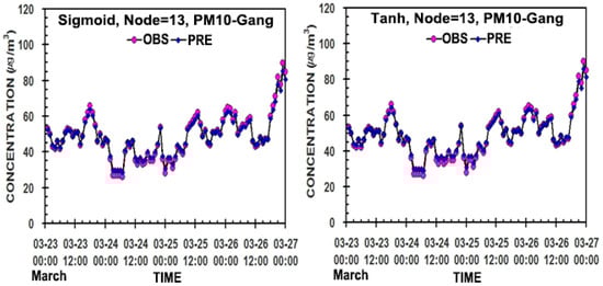 Since very high Pearson R values were in the range of 0.917 to 0.953 (ANN-sigmoid), and 0.938 to 0.960 (ANN-tanh) for PM10 and PM2.5, except for 0.880 (0.880) for NO2 in sigmoid, and 0.886 in tanh, the two models maintain the excellent prediction performance for air quality, regardless of the activation functions and hidden node numbers. However, the ANN-tanh model showed clearly better prediction ability than the ANN-sigmoid model, and the more mode numbers in the hidden layer, the better the prediction model.