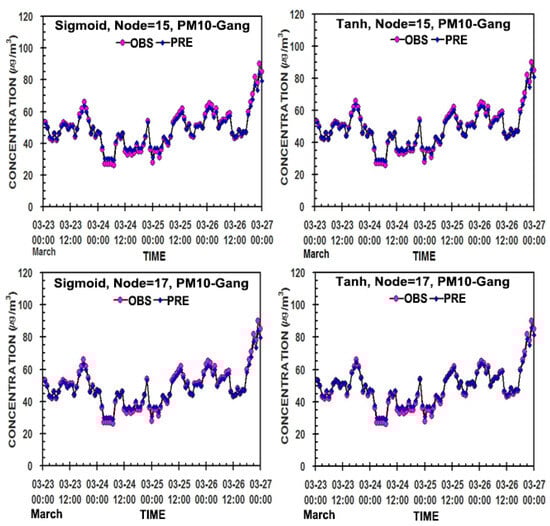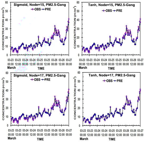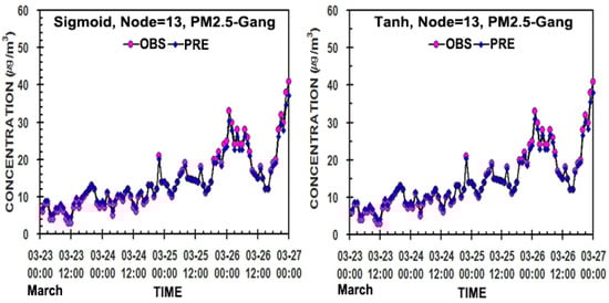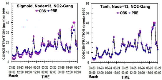 Figure 6, Figure 7 and Figure 8 present the hourly distributions of the predicted values of PM10, PM2.5, and NO2 concentrations to compare with their measured values in 13, 15, and 17 nodes in the hidden layer of the two models. Regardless of different node numbers and activation functions, the predicted values of PM10 and PM2.5 through the two models’ simulations were very close to the measured ones, except for a slight bias in 13 and 17 nodes in sigmoid and 15 nodes in tanh for NO2 (Table 2, Figure 3, Figure 4 and Figure 5).