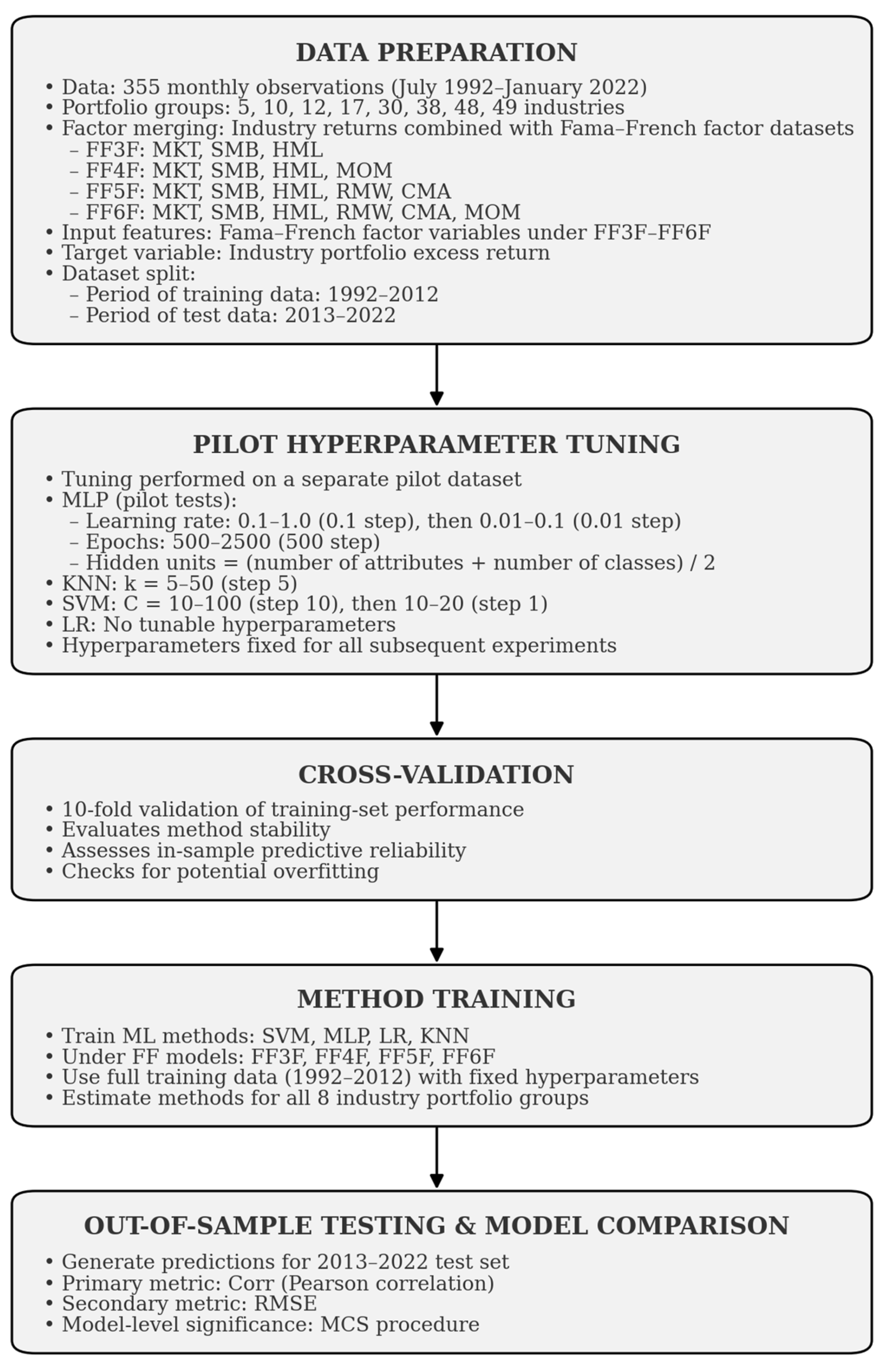 The main objective of this research was to assess the out-of-sample prediction performance of the ML methods for modeling excess returns under the FF3F, FF4F, FF5F, and FF6F asset pricing models. Each specification was evaluated across U.S. industry portfolios grouped into 5-, 10-, 12-, 17-, 30-, 38-, 48-, and 49-industry classifications, as defined by Fama and French. The ML techniques applied included SVR, LR, KNN, and MLP.
