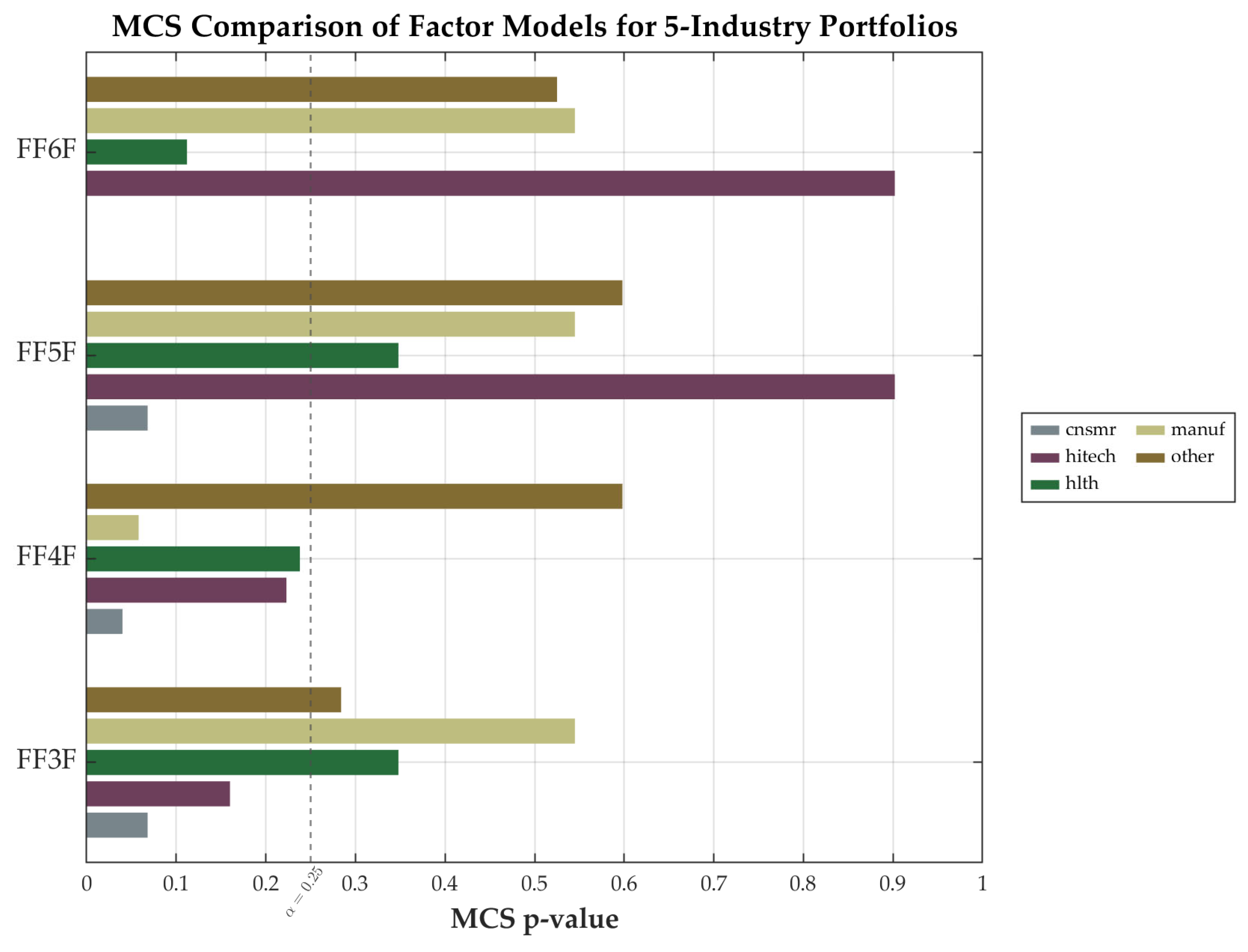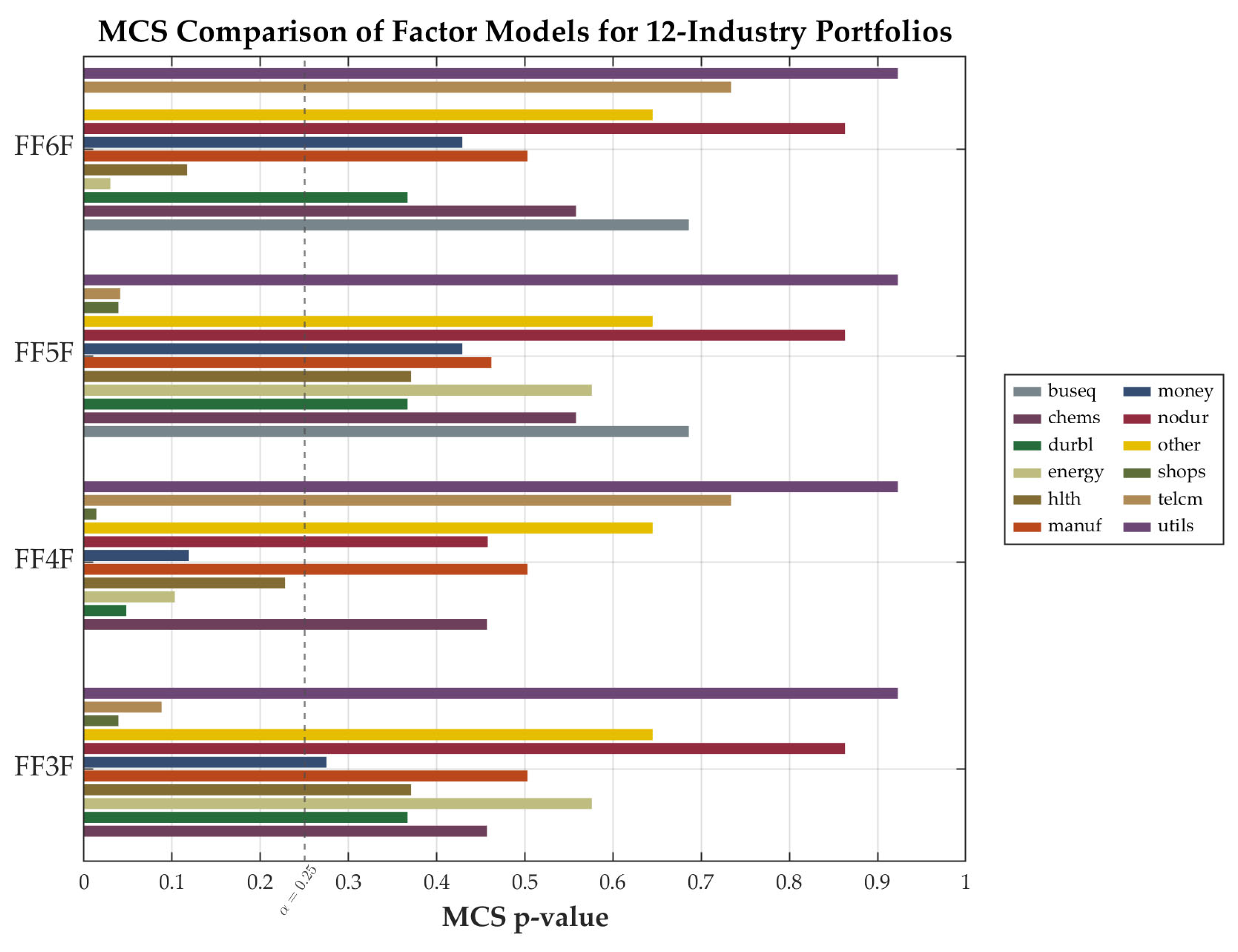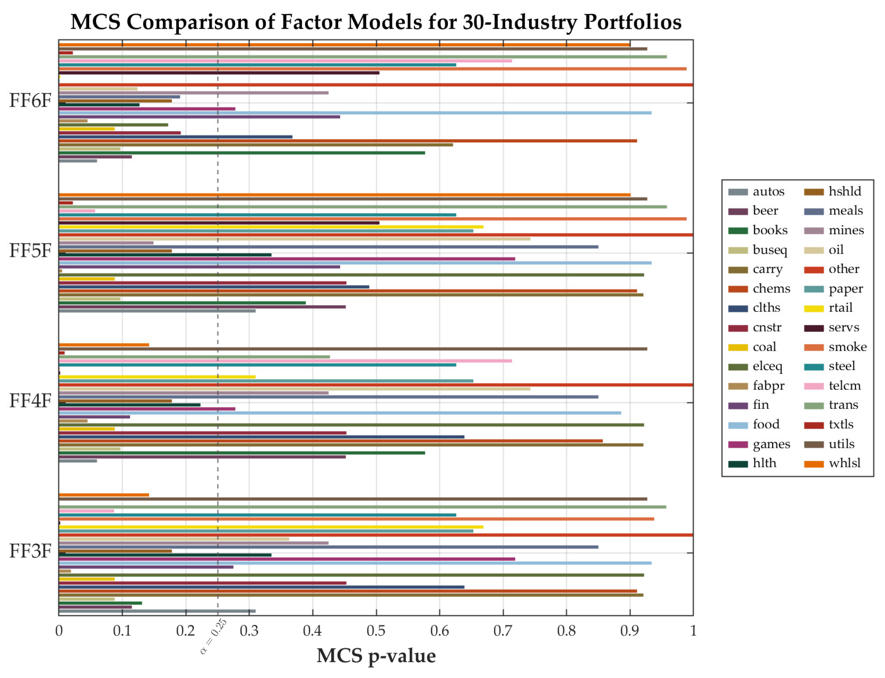 The 30-industry MCS results revealed a configuration in which model support is neither concentrated nor evenly dispersed, but instead follows a tiered structure. FF5F stood out with 23 retained portfolios, confirming that this specification remained competitive across a wide span of sectors. FF3F and FF4F were each retained in 20 portfolios, showing comparable levels of acceptance despite representing distinct factor compositions. FF6F appeared less frequently, with 16 inclusions, suggesting a more limited scope under the current significance threshold. Certain industries, including BUSEQ, COAL, HSHLD, and TXTLS, did not retain any specification, indicating that none of the tested models offers sufficient statistical proximity to the non-inferiority region in these particular cases, a result consistent with the