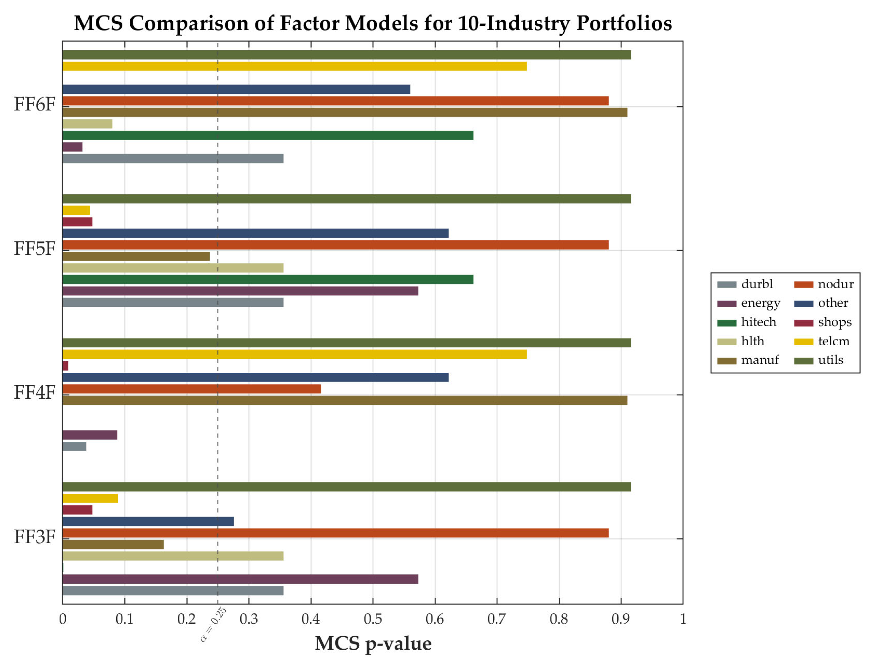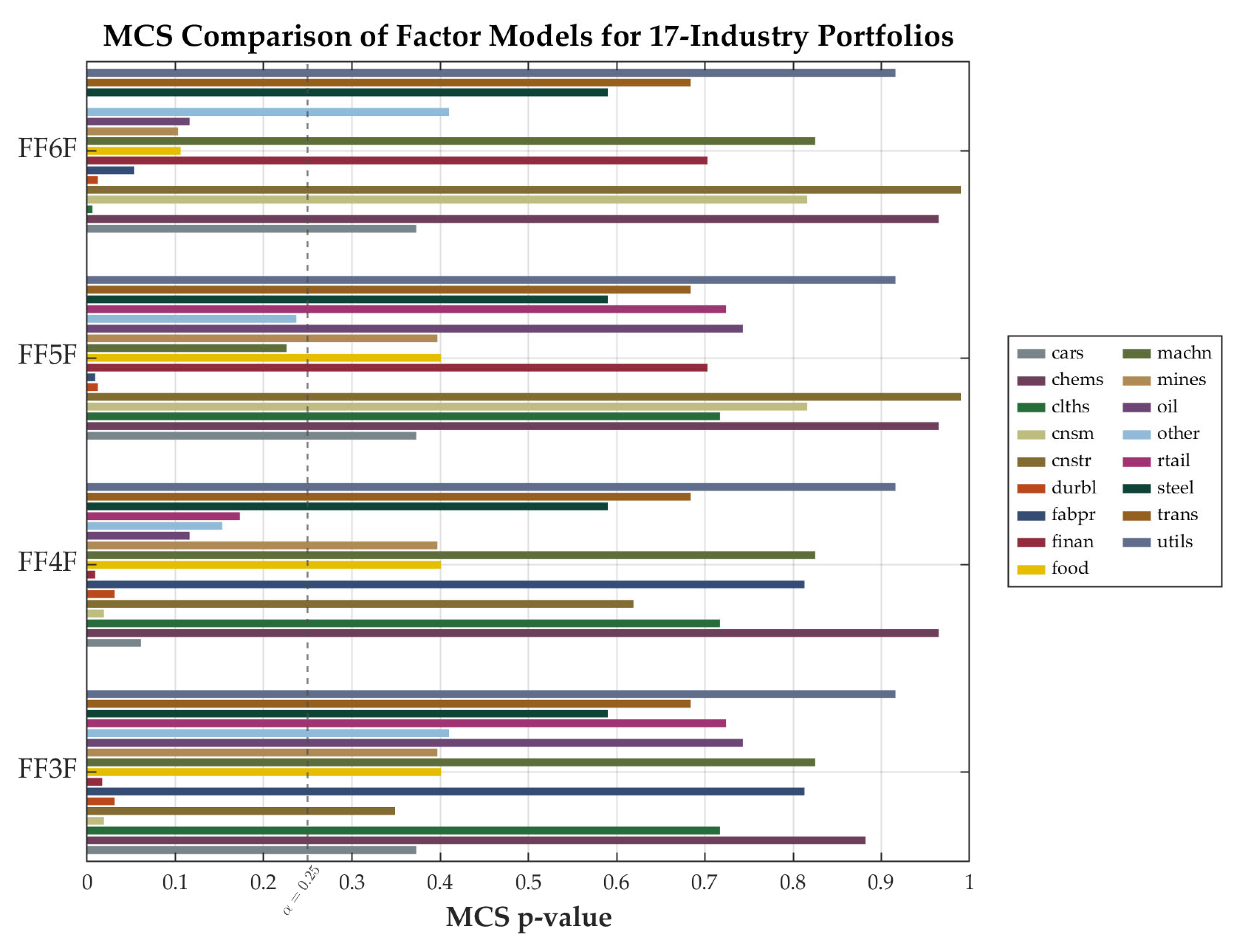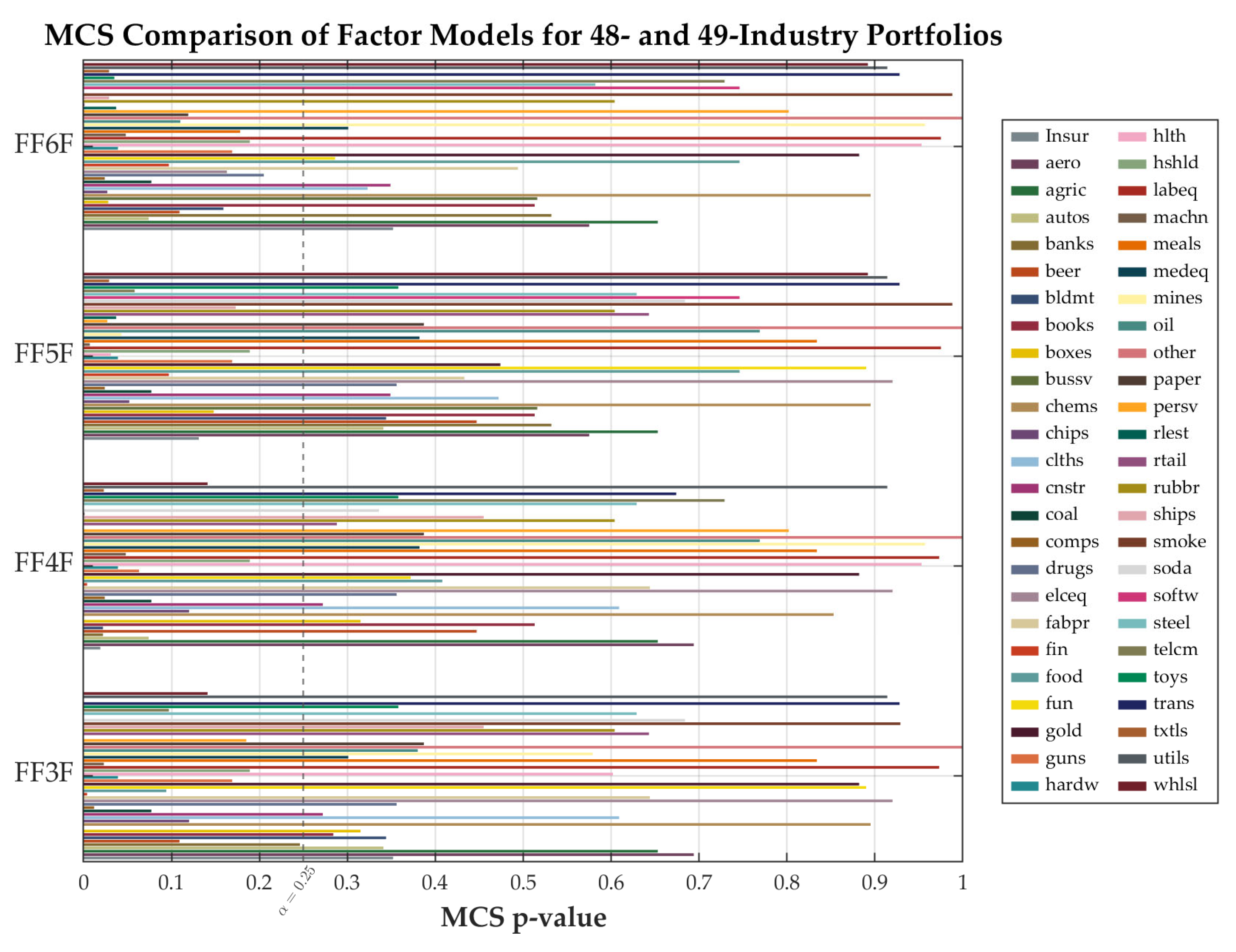 The 30-industry MCS results revealed a configuration in which model support is neither concentrated nor evenly dispersed, but instead follows a tiered structure. FF5F stood out with 23 retained portfolios, confirming that this specification remained competitive across a wide span of sectors. FF3F and FF4F were each retained in 20 portfolios, showing comparable levels of acceptance despite representing distinct factor compositions. FF6F appeared less frequently, with 16 inclusions, suggesting a more limited scope under the current significance threshold. Certain industries, including BUSEQ, COAL, HSHLD, and TXTLS, did not retain any specification, indicating that none of the tested models offers sufficient statistical proximity to the non-inferiority region in these particular cases, a result consistent with the