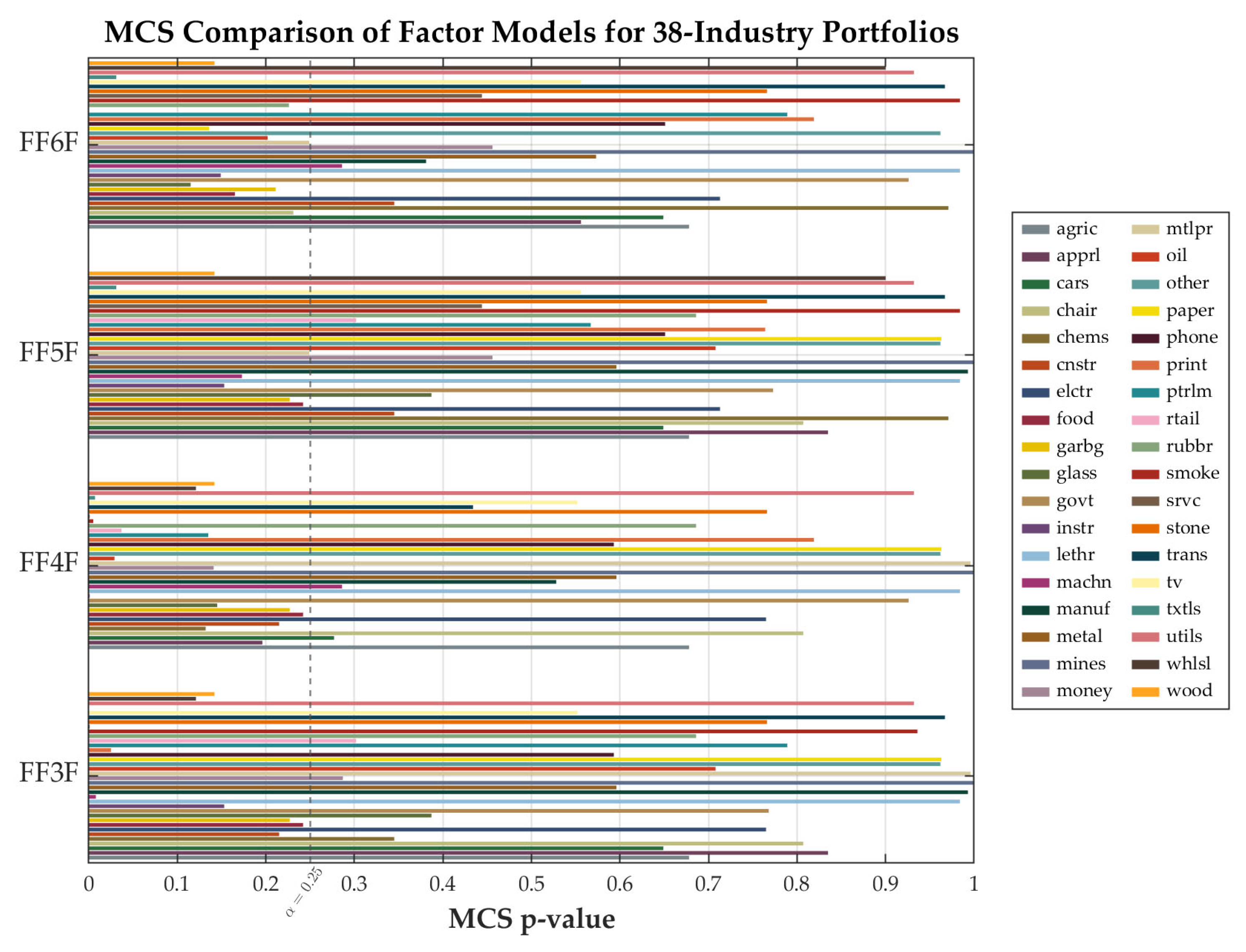 The MCS outcomes for the 38-industry group revealed substantial dispersion in model support. FF5F was retained in 31 portfolios, emerging as the most widely accepted specification in this expanded setting, while FF6F and FF3F followed with 27 and 29 retained portfolios, respectively. FF4F remained admissible in 23 portfolios, marking the lowest level of support among the four models. Several industries, including INSTR, FOOD, GARBG, TXTLS, and WOOD, produced empty superior sets, indicating that none of the tested factor structures satisfied the MCS retention criterion under the chosen threshold for these sectors. This outcome reflects the well-known sensitivity of the MCS procedure to the selected significance level, as stricter thresholds would allow at least one specification to remain admissible in these industries.
