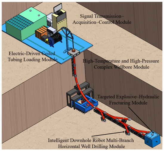 - Downhole robot module: This module is designed to perform combined explosive–hydraulic fracturing. The traction robot drags the tubular string to deliver explosives to the branch wellbore. After the string is pulled back to a safe position, detonation is initiated, followed by hydraulic fracturing operations at the explosion site. This enables efficient fracturing of multilateral wells.