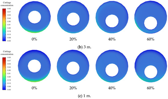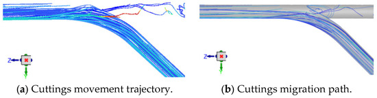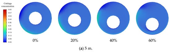 Through the analysis of the temporal evolution of particle volume fraction, the transient simulation clearly reveals the overall migration path and time-dependent characteristics of the cuttings. As shown in Figure 8, at the early stage of 5 s, particles are carried into the annulus by the drilling fluid flowing through the horizontal branch wellbore. The overall concentration of cuttings within the wellbore is relatively low, and although most particles gradually settle at the bottom of the main wellbore and near its lower end, the variation in concentration along the wellbore remains minor.