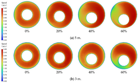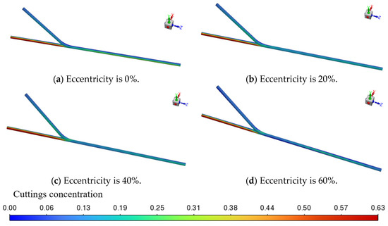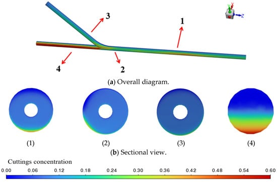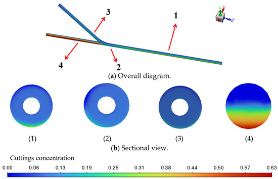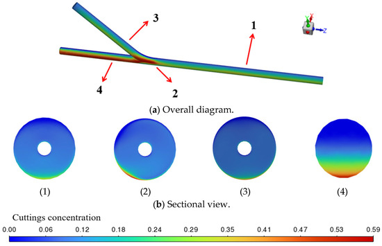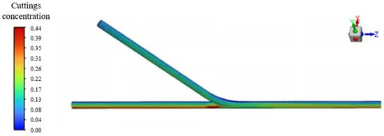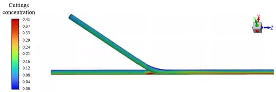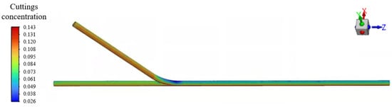 The transient simulation results of the cuttings volume fraction distribution are shown in Figure 6, where cuttings are primarily deposited near the bottom end of the main wellbore. As illustrated in Figure 7, when viewed from a bottom-up perspective, the transient simulation reveals the dynamic behavior of cuttings transport. It can be clearly observed that as the drilling fluid flows from the horizontal branch wellbore into the main wellbore, a noticeable backflow occurs at the junction between the curved and main sections. This backflow causes part of the cuttings to be carried and subsequently deposited at the lower region near the bottom end of the main wellbore.