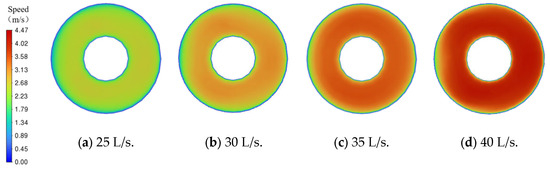 At the computational domain inlet, the boundary condition is defined as a velocity inlet, with the liquid phase inlet velocity set to 2.8 m/s and the solid phase inlet velocity set to be identical to that of the liquid phase. At the outlet, a pressure outlet boundary condition is applied, with the pressure specified as 1 MPa. To better match field conditions, the Euler–Euler two-fluid model is adopted, in which both the solid and liquid phases are treated as pseudo-continuous media that exist independently yet interpenetrate with each other.