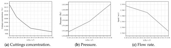 - Flow rate and rheological parameters significantly affect carrying capacity. Higher flow rates improve hole-cleaning performance in the main wellbore but also enhance backflow near the lower end, promoting redeposition. When the flow behavior index n increases from 0.4 to 0.8, the average cuttings concentration rises from 9.96% to 10.08% and the pressure loss increases from 1,010,894 Pa to 1,042,880 Pa, indicating enhanced transport but higher energy loss. Increasing the consistency index k raises viscosity and pressure loss, slightly reducing overall transport efficiency.