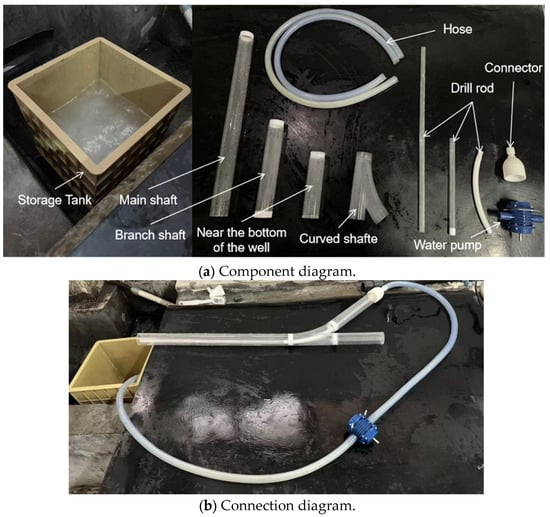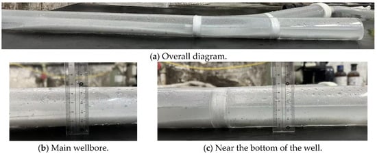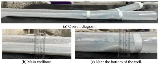 After completing the experiment, the addition of the sand–water suspension was gradually stopped, and only clean water was circulated for a period of time to flush out any residual sand particles in the wellbore, restoring the system to a cleaner state. The residual fluid in the wellbore and piping was then drained, and the experimental setup was dismantled and organized.