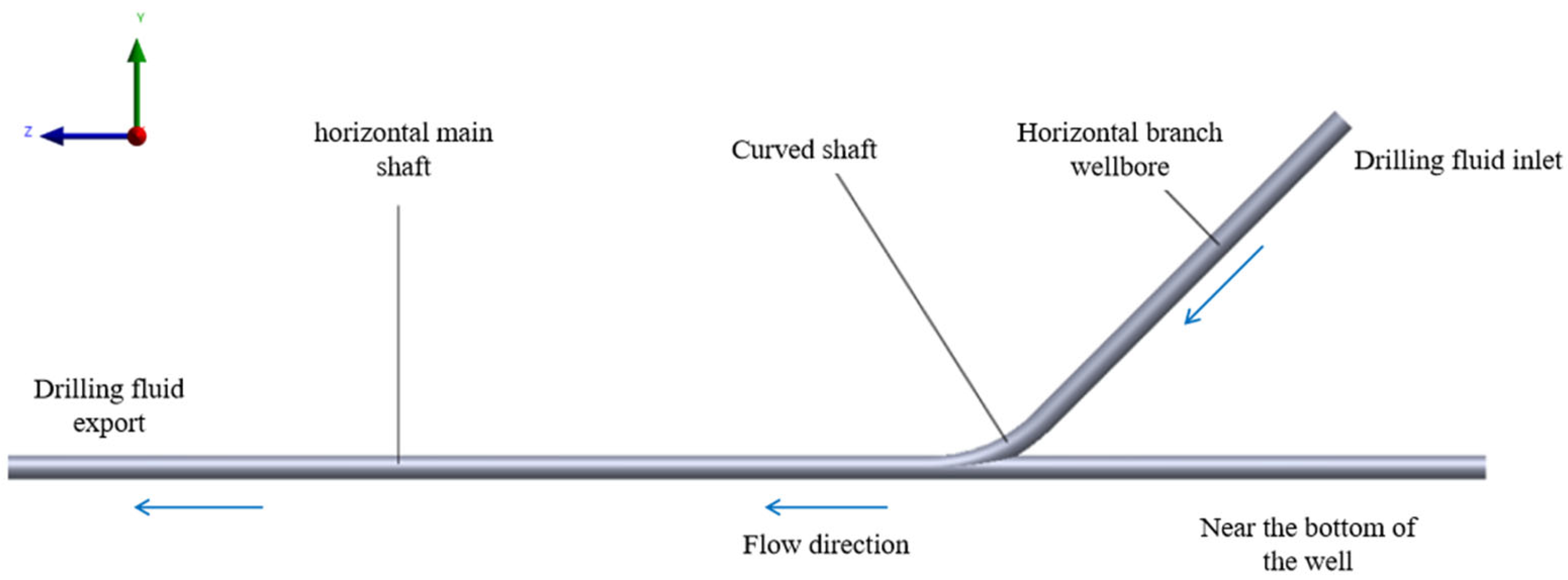 The drilling fluid enters the system from the right-hand side of the figure, flowing along the Z–Y plane in a curved manner and ultimately exiting the system in the positive direction of the Z-axis at the main wellbore outlet. The geometric relationships between the branched wellbore, curved wellbore, and horizontal main wellbore are defined according to this coordinate system.
