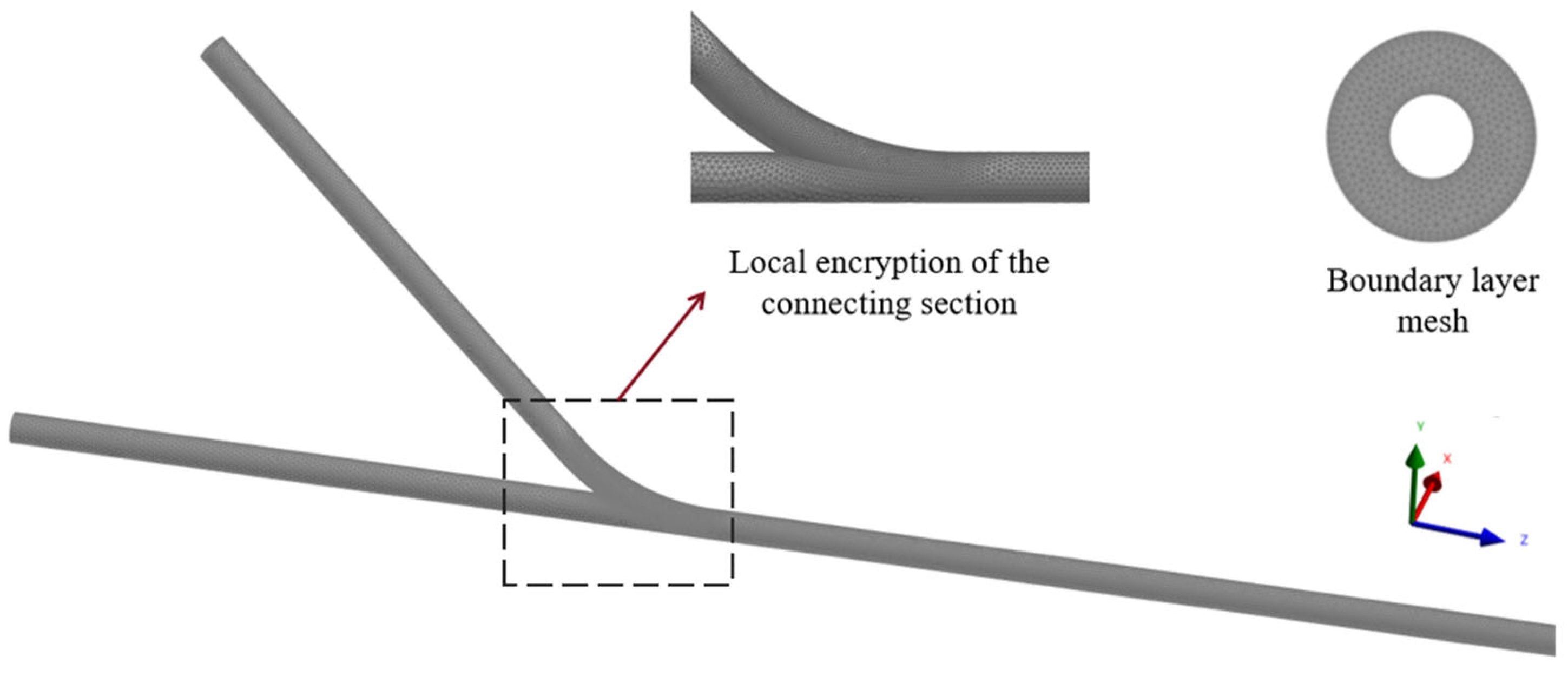 The length of the main wellbore is set to 5000 mm, and the length of the branched wellbore is 2300 mm, with an angle of 45° corresponding to the curve to better simulate the flow diversion characteristics in the branched wellbore structure. The model has simplified the structure of the wellbore wall and joints for simplicity and reduced the influence of small-scale boundary movements.