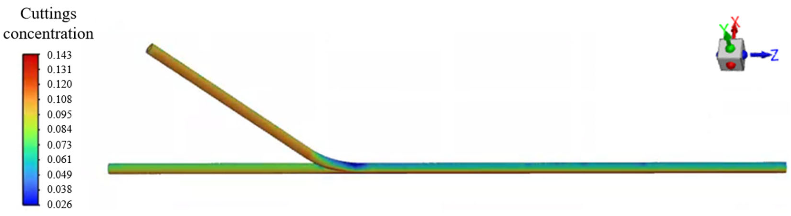 Figure 22 shows that increasing the flow rate markedly elevates the annular velocity at the junction, with the cross-sectional average rising from 2.33 m/s to 3.73 m/s. The velocity contours also indicate a pronounced shrinkage of low-velocity zones and a more uniform velocity distribution across the section. While higher velocities enhance momentum transfer and help sweep cuttings out of low-speed deposition regions, thereby reducing the likelihood of settling, high flow rates simultaneously intensify recirculation. As a result, despite improved cleaning of the upstream main wellbore, cuttings accumulation near the lower end of the main wellbore increases, leading to a higher local concentration in that region.
