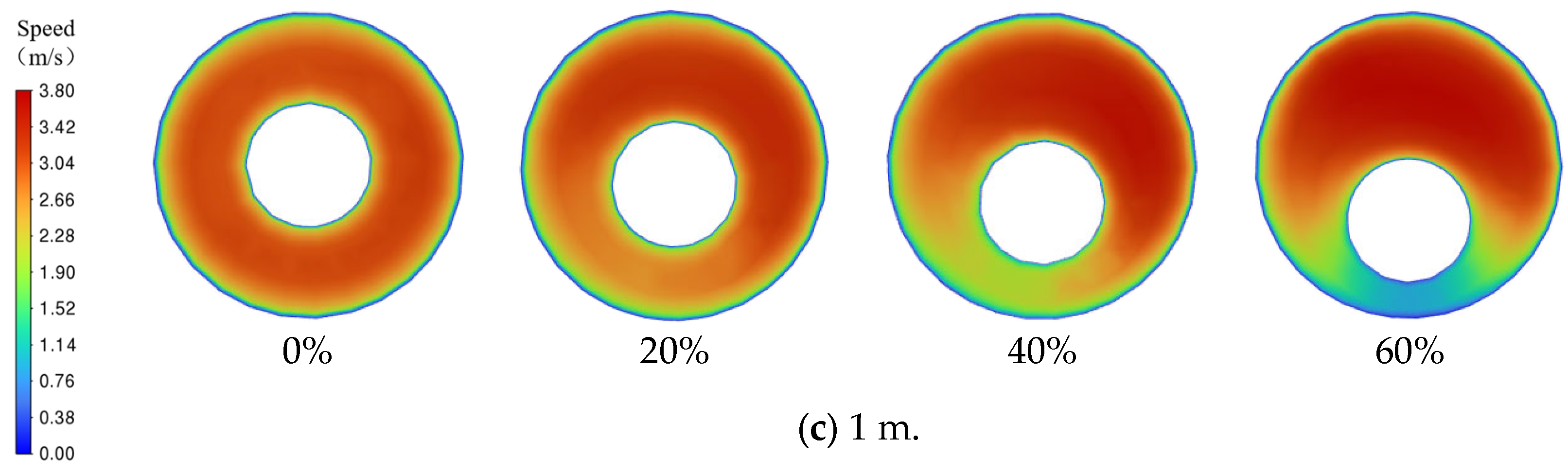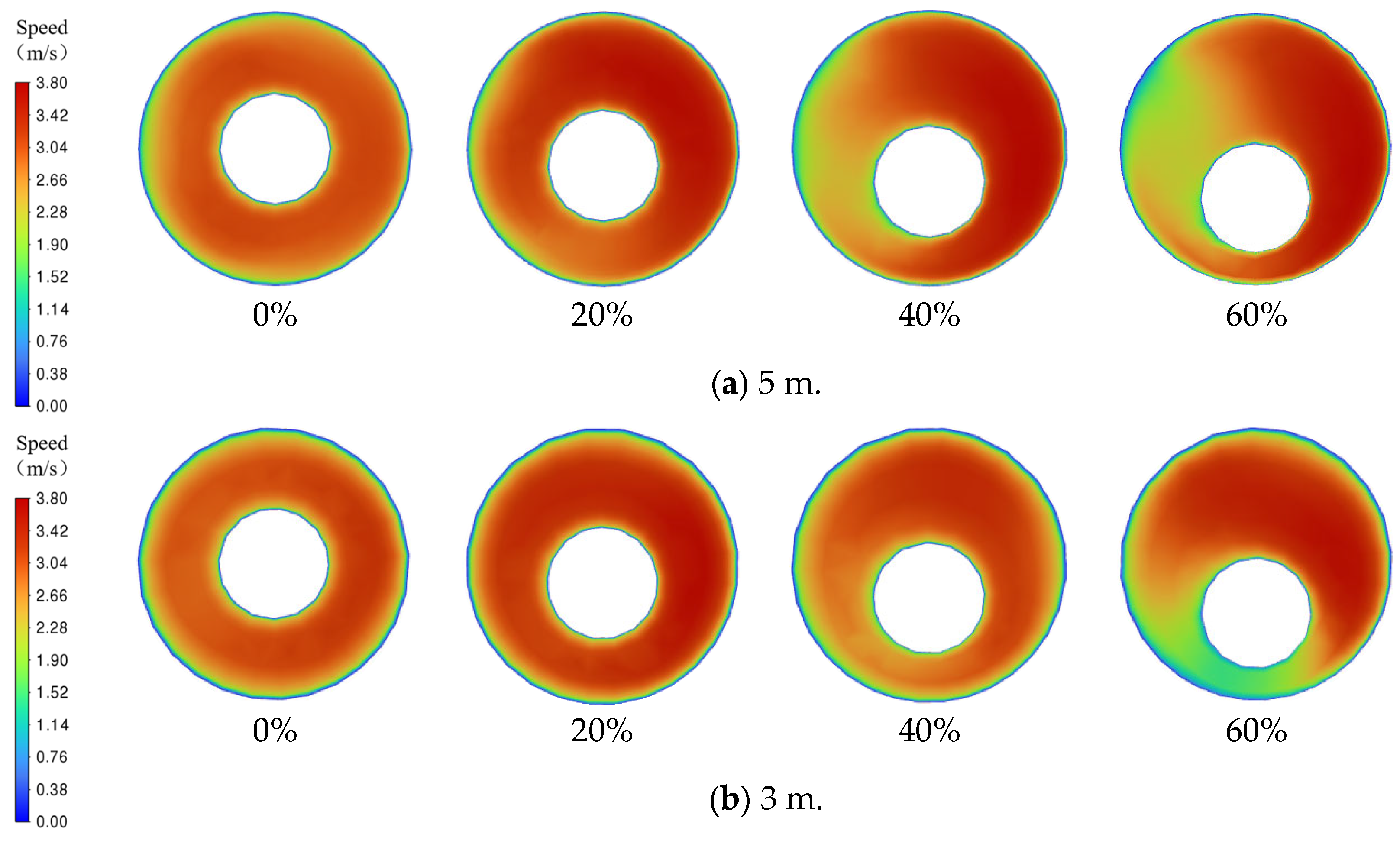 Figure 17 demonstrate that eccentricity also has a significant impact on the velocity distribution. At 5 m, where the branched wellbore connects to the main wellbore, the velocity near the branched wellbore is significantly lower than that far from the branched wellbore. As eccentricity increases, this trend becomes more pronounced. From the velocity cross-sectional cloud plots at 5 m, 3 m, and 1 m from the outlet, it can be observed that the cuttings transport velocity in the lower annular region near the wellbore wall decreases significantly, and the high-velocity region gradually shifts upward in the wellbore, showing a distinct shift in the flow field.