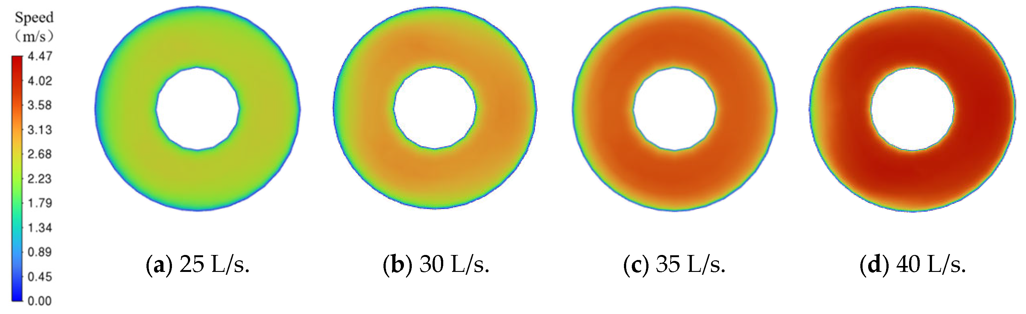 Figure 21, it can be observed that increasing the flow rate significantly alleviates cuttings accumulation in the lower part of the wellbore. The cross-sectional average cuttings volume fractions at flow rates of 25 L/s, 30 L/s, 35 L/s, and 40 L/s are 10.04867%, 10.00945%, 9.993403%, and 9.967008%, respectively. Although the overall reduction in average concentration is relatively small, the area of high-concentration regions decreases and the concentration gradient becomes smoother with higher flow rates, indicating an improved cuttings transport effect. In particular, at 35 L/s and 40 L/s, the cuttings distribution is more uniform and the overall concentration is reduced, demonstrating the enhanced carrying efficiency at larger flow rates.