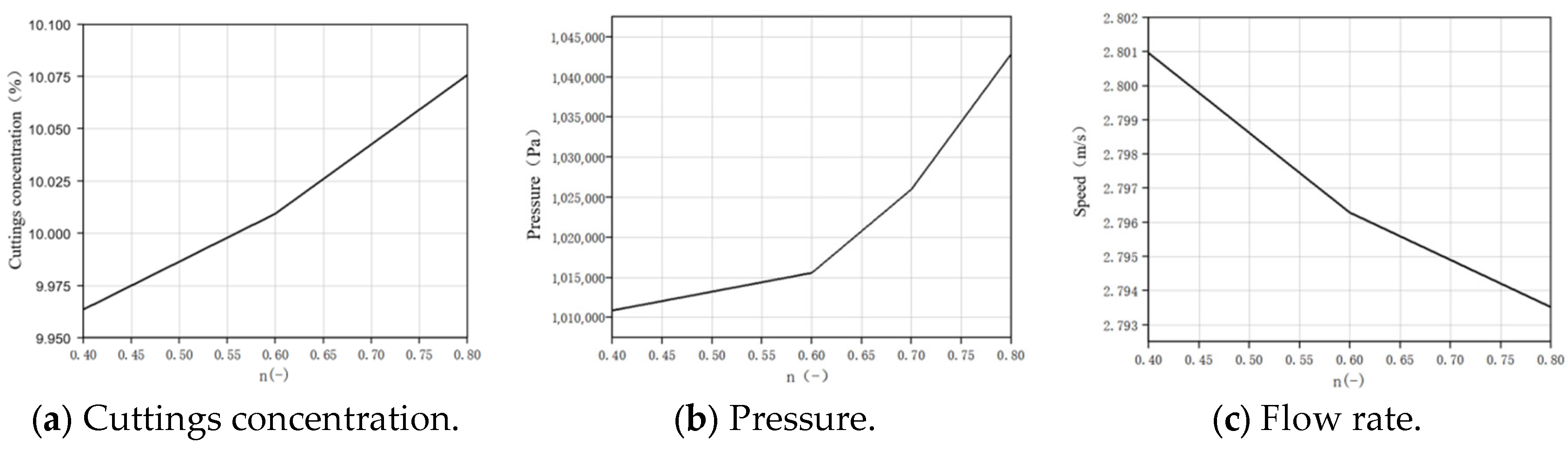 As n increases from 0.4 to 0.8, the average cuttings volume fraction rises from 9.96% to 10.08%, showing a gradual upward trend, which indicates that as the shear-thinning property of the fluid weakens, cuttings in the annulus are more easily suspended and carried. Meanwhile, the wellbore pressure increases from 1,010,894 Pa to 1,042,880 Pa, reflecting a significant rise in pressure drop. The average velocity, however, decreases slightly from 2.801 m/s to 2.794 m/s. These results suggest that a larger flow behavior index enhances cuttings-carrying capacity, but at the expense of higher-pressure losses and a slight reduction in velocity.