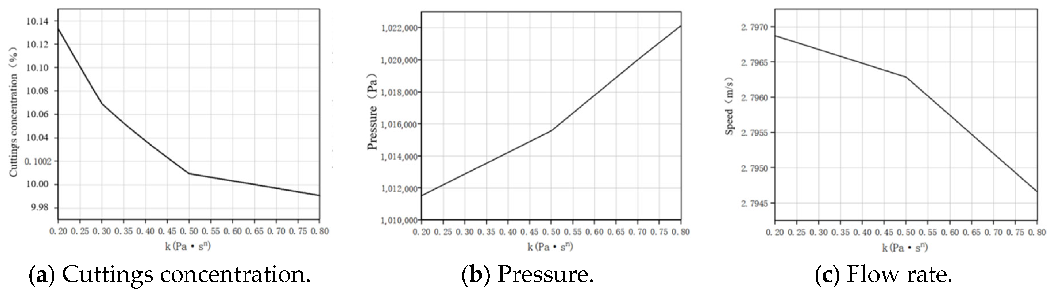 In summary, the rheological parameters of non-Newtonian fluids exert a significant influence on the cuttings transport process. An increase in the flow behavior index (n) enhances the suspension and carrying capacity of cuttings but leads to greater annular pressure drops. Conversely, an increase in the consistency index (k) primarily manifests as elevated flow resistance and suppressed velocity, while the cuttings volume fraction shows a slight decrease.
