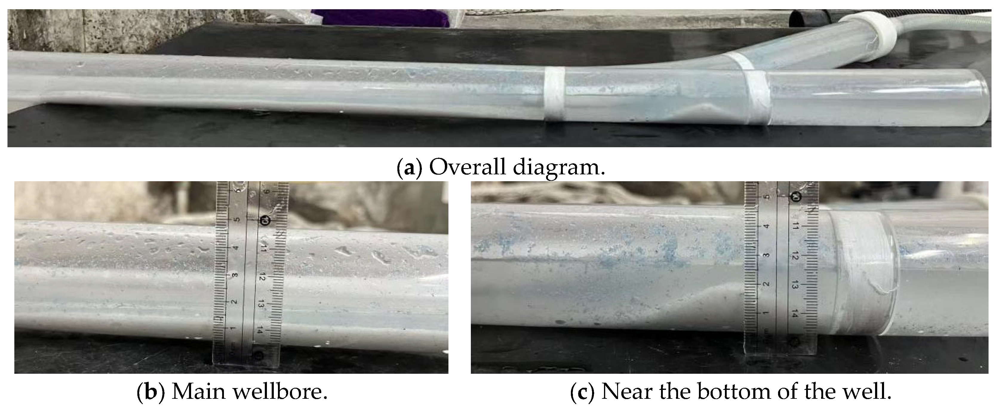 Based on the above analysis, under the present experimental conditions and model settings, increasing the drilling fluid flow rate effectively enhances the flow field strength and the cuttings-carrying capacity in the main wellbore section, suppressing particle accumulation at the junction and improving the overall cuttings transport performance in complex wellbore geometries. This enhancement contributes to higher hole-cleaning efficiency. However, in the lower end region of the main wellbore, the intensified recirculation associated with higher flow rates leads to an unexpected rise in the average cuttings concentration, resulting in more severe particle deposition along the wellbore bottom.