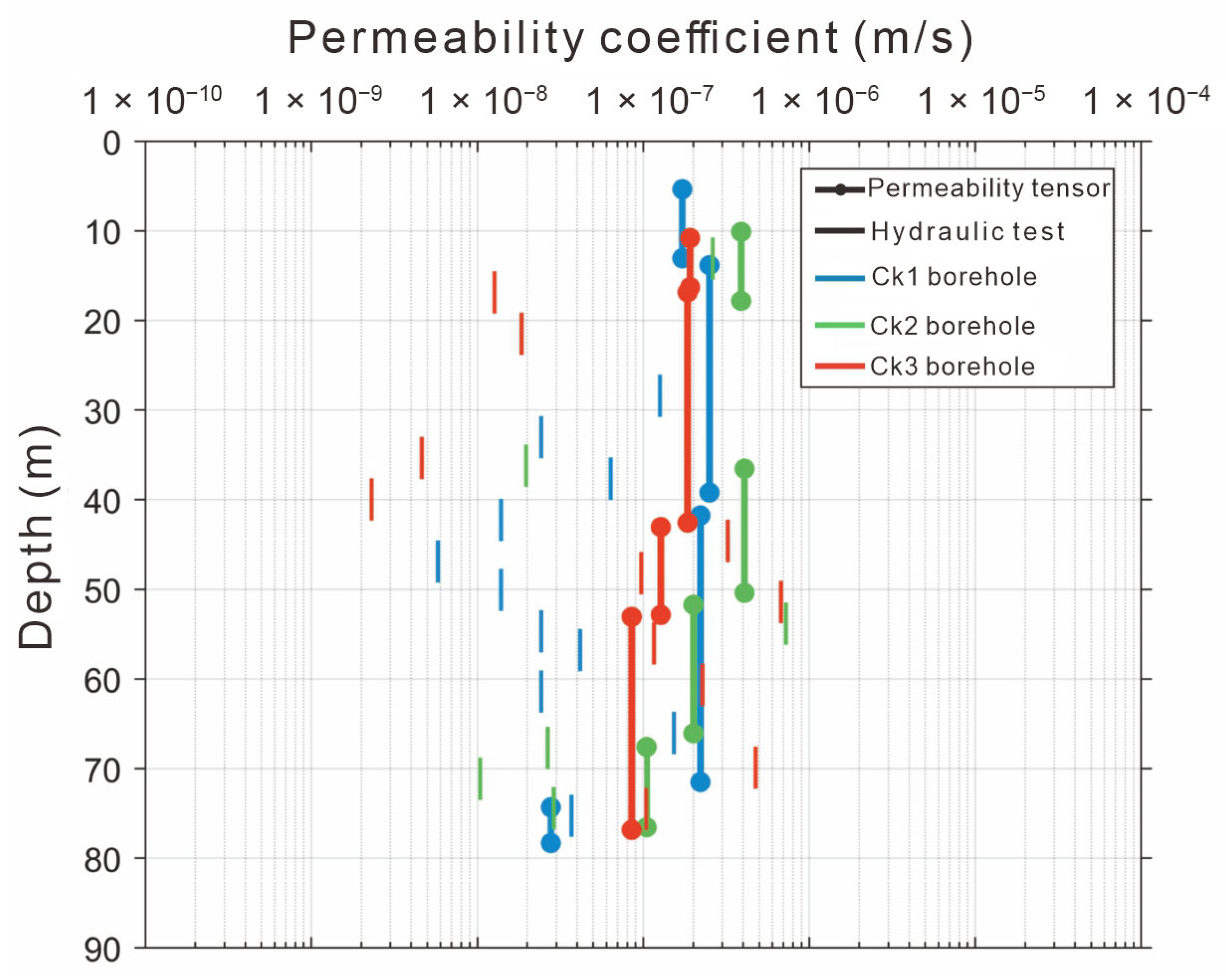 Overall, permeability coefficients calculated using the tensor approach tend to exceed those obtained from hydraulic testing, and the measured coefficients exhibit greater vertical variability. This is because the permeability tensor calculation does not consider fracture connectivity, and the presence of fracture fillings can also lead to overestimation of the calculated permeability coefficient. Specifically, the hydraulic test value in the deeper part of CK3 is larger than the result from the permeability tensor calculation. This is because the deeper part of this borehole intersects fewer fractures with larger spacing, resulting in a smaller comprehensive permeability coefficient. Hence, relying solely on tensor-based calculations may introduce significant deviations, and a comprehensive approach considering multiple influencing factors is essential for accurately assessing subsurface permeability.