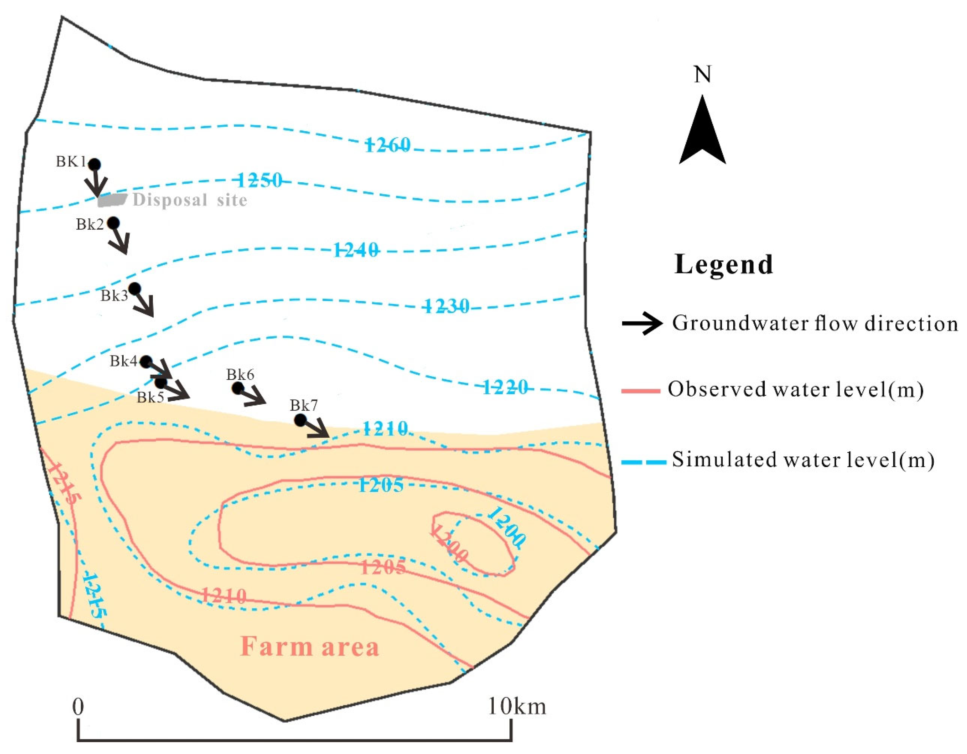 For the fractured media extensively developed in the northern part of the study area, permeability parameters derived from both field hydraulic tests and theoretical fracture-permeability tensor calculations were integrated. The northern part of the study area is dominated by fractured media, whereas the southern part is primarily composed of porous media. To enable integrated numerical simulation of the entire region, the subsurface media were therefore conceptualized uniformly as an effective porous medium. Based on this conceptualization, a three-dimensional groundwater flow model of the study area was constructed using the MODFLOW module within GMS software. First, a steady-state flow model was established. In regions of the north where groundwater observation wells were sparse, the simulated groundwater flow field was verified using results from the field groundwater flow direction tests. Subsequently, a transient flow model was developed, and long-term groundwater level variations were calibrated against data from dynamic monitoring wells within the study area. Finally, the calibrated model was applied to simulate groundwater level responses at the disposal site under various precipitation conditions and groundwater-extraction scenarios.