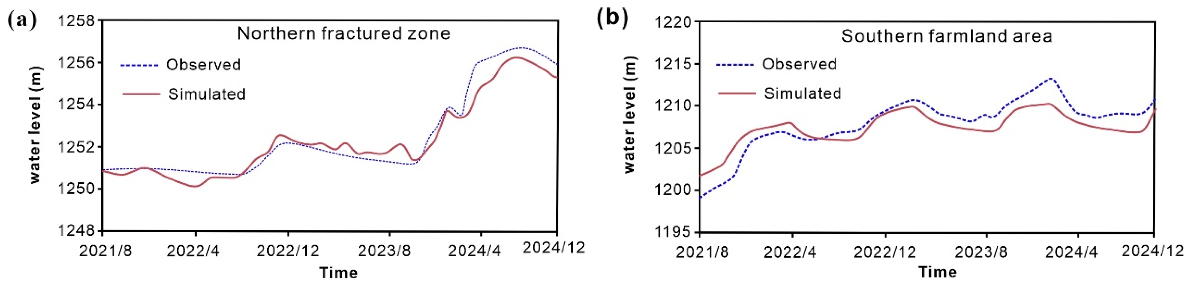 In summary, considering the comparison of simulated and measured flow fields in the southern farm area, the comparison between measured flow directions and the simulated flow field in the northern fractured area, and the fitting of long-term groundwater level trends in both north and south observation wells, the accuracy of the constructed numerical model is sufficient to support subsequent predictions of groundwater level changes under different scenarios.