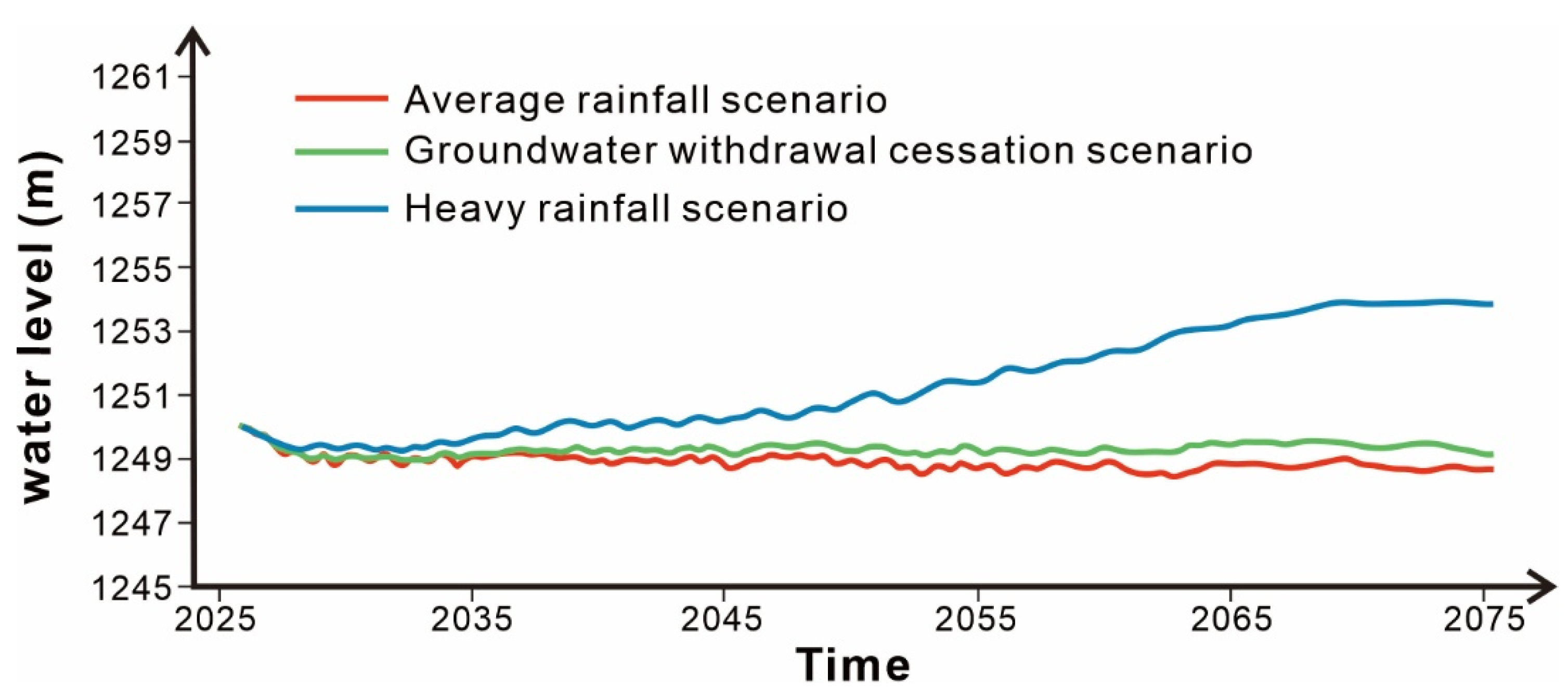 Figure 6. Under the average-rainfall scenario, the groundwater level at the disposal site remained essentially stable throughout the 50-year simulation period. The cessation of groundwater extraction in the southern agricultural zone exerted only a minor influence on groundwater levels at the northern disposal site. This influence became evident approximately 14 years after pumping cessation, reaching its maximum around 38 years later (in 2063), when the groundwater level increased by about 0.3 m. This weak response is primarily attributed to the dominance of low-permeability fractured rocks in the northern part of the study area, which results in slow groundwater flow. Moreover, the disposal site is located approximately 5 km from the agricultural area. Consequently, the reduction of southern pumping had only a minor impact on groundwater levels at the disposal site. In contrast, increased rainfall intensity had a more pronounced effect. This is attributable to the combined effects of the direct influence of rainfall on groundwater levels and the increased piedmont lateral recharge associated with higher precipitation. After 50 years, under the heavy rainfall scenario, the groundwater level at the disposal site rose by approximately 5.2 m relative to the average rainfall scenario. With the elevation of the disposal unit’s base slab at 1259 m, the current groundwater level is now 6 m below it. From the perspective of groundwater level response to rainfall and downstream anthropogenic extraction, regulators must pay particular attention to changing climatic conditions. Under persistent heavy rainfall, appropriate drainage measures should be taken to ensure the safe operation of the disposal site.