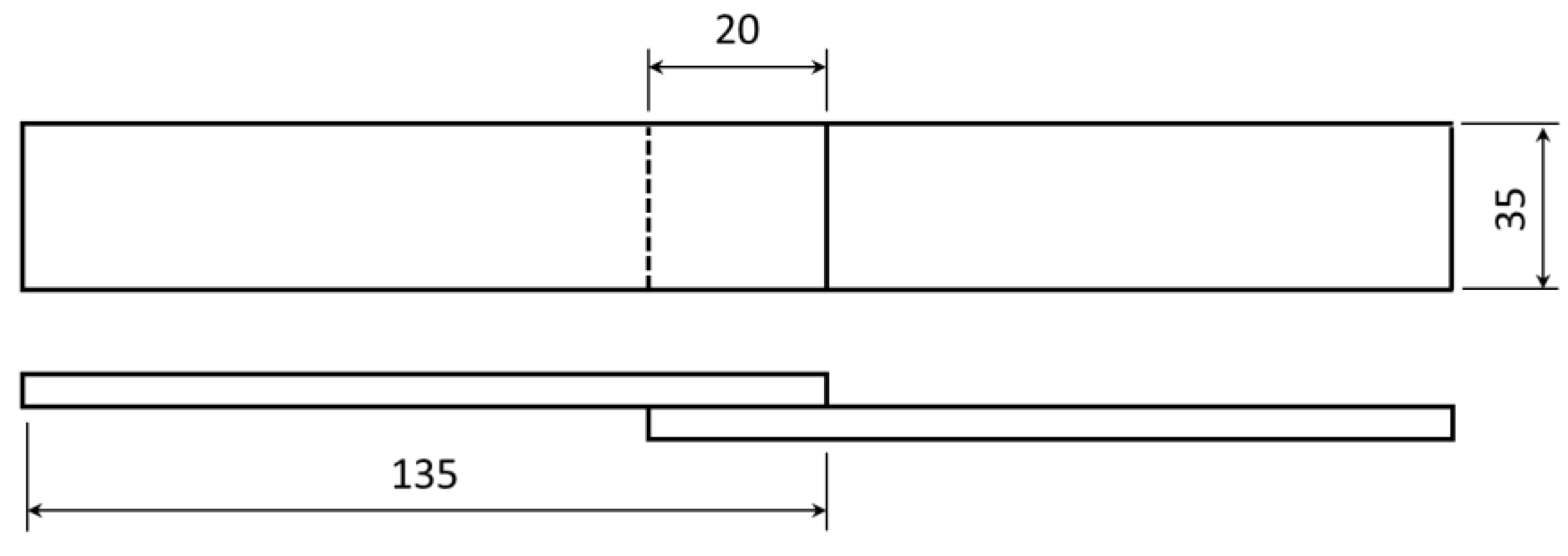 To evaluate the bonding strength of sheet metal components using structural adhesives, experimental specimens were prepared. The dimensions of the sheet metal samples were specified as 135 mm × 35 mm with a thickness of 1.2 mm (
