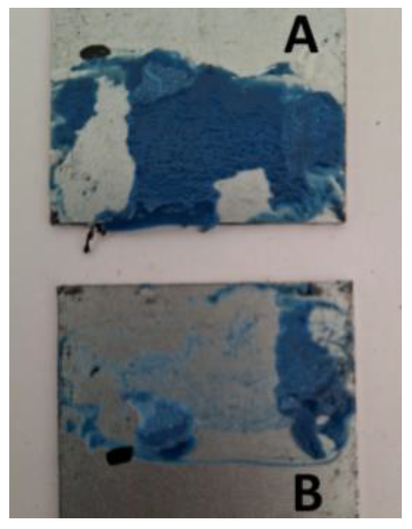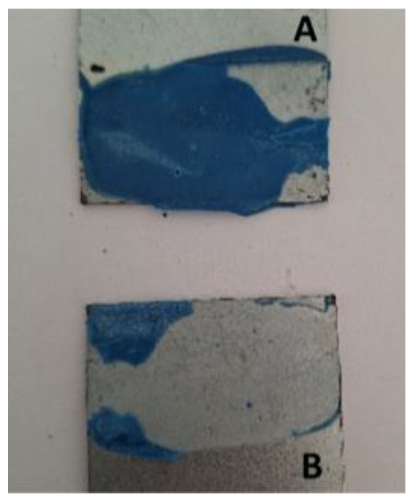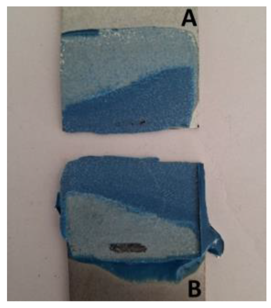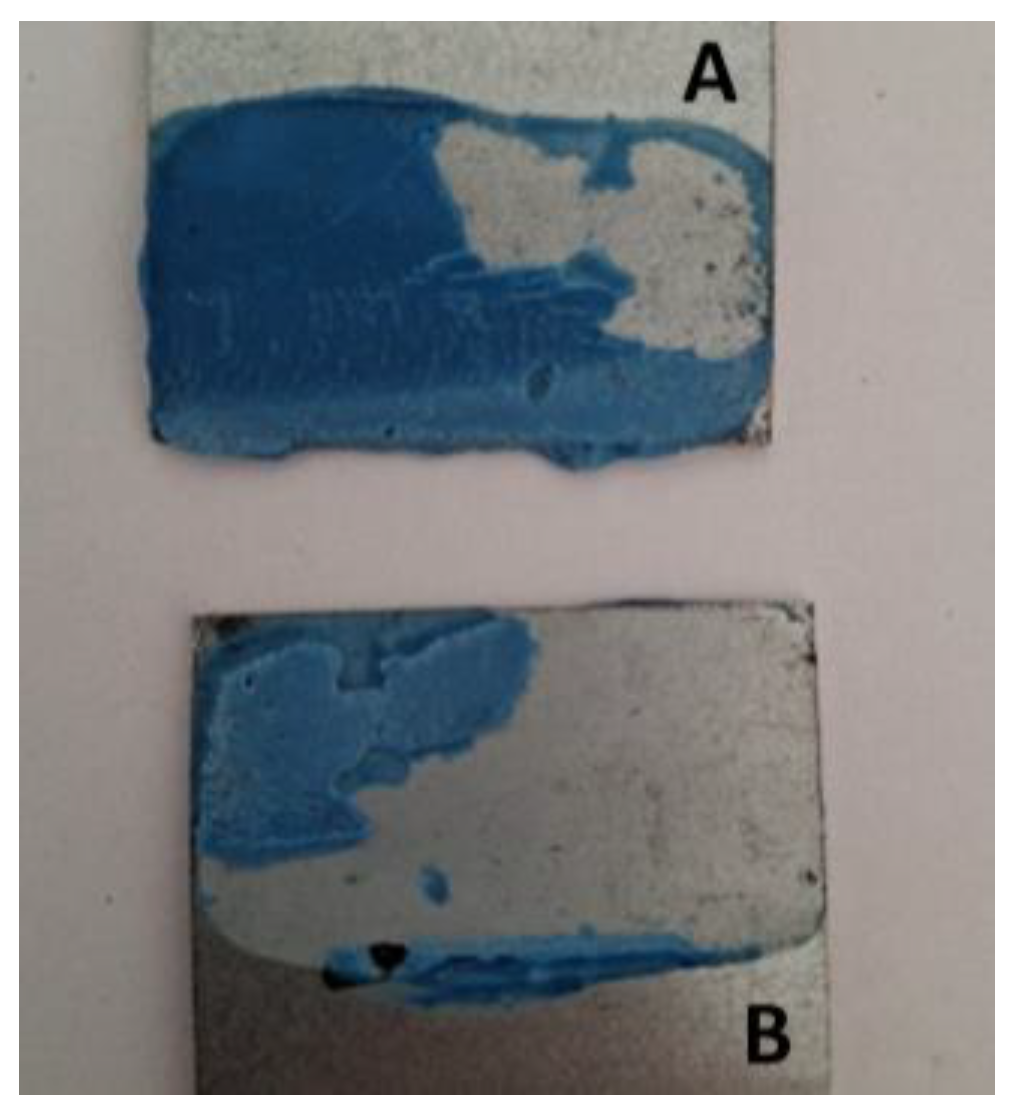 Experiment 10 showed extensive bare metal regions on both adherends, indicating adhesive failure. Adhesive residue was primarily located on Sheet A, with complementary voids on Sheet B. No cohesive fracture features were observed (