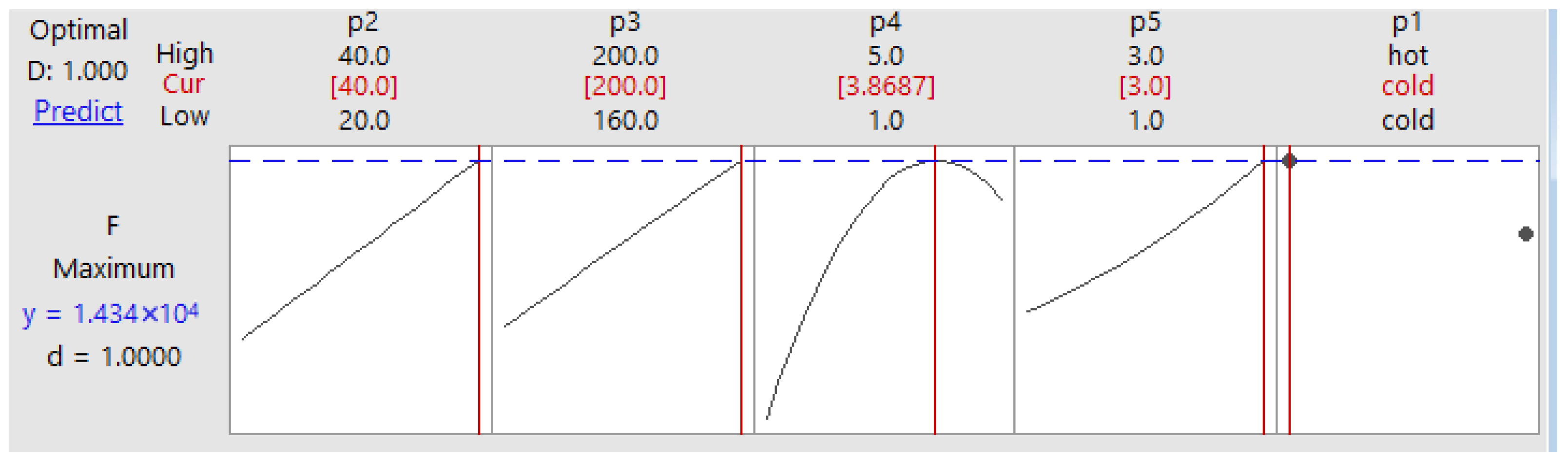 Using the “Response Optimizer” module in the Minitab 17 software, the optimal parameter values that maximize fracture load were calculated based on the lower and upper limits of the parameters presented in