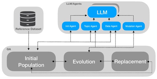 The proposed model connects the use of LLMs with an evolutionary model, following a multi-agent approach, to automate the prompt generation for creating synthetic text datasets. Our approach applies a Genetic Algorithm (GA). Our proposal is presented in Figure 1. It is implemented following a multi-agent approach. We have three main actors: (1) the LLM, (2) the agents, and (3) the genetic algorithm.