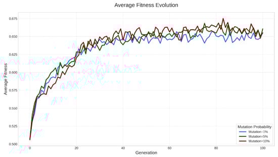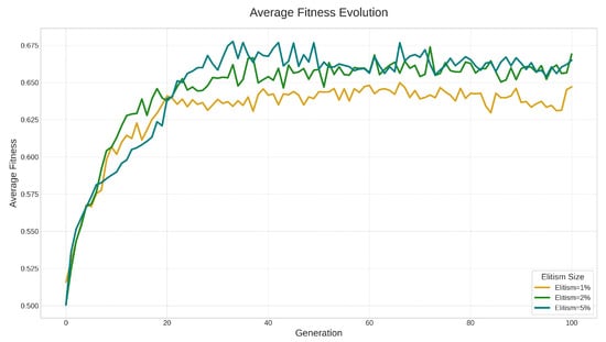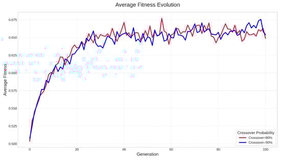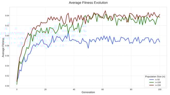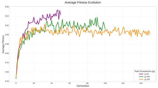 As depicted in Figure 3, the evaluation of population sizes reveals distinct performance trade-offs. The configuration (blue line) demonstrates significantly hindered performance, exhibiting premature convergence. Its average fitness plateaus early, struggling to surpass a value of 0.60, which is considerably lower than the fitness achieved in the other scenarios. In contrast, both the (green line) and (red line) configurations achieve a much higher average fitness, successfully converging to a similar and more desirable plateau (fluctuating roughly between 0.62 and 0.64). Although both runs evidence that they can reach a comparable fitness over time, the run provides no significant advantage over the run. Therefore, we selected as the ideal population size, as it offers a superior computational trade-off, achieving robust fitness results without the additional computational overhead incurred by 150 individuals.