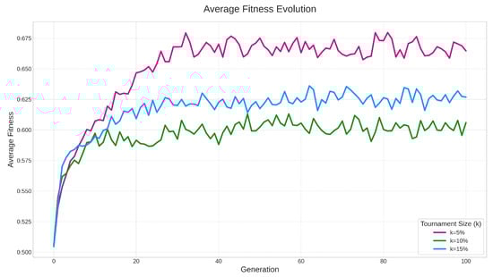 We study the impact of the tournament size (k), a critical hyperparameter that directly modulates selection within the genetic algorithm. The tournament size defines the number of individuals randomly sampled from the population to compete for selection. This parameter governs the trade-off between population diversity and convergence speed. A small tournament size () exerts low selection pressure, as even lower-fitness individuals have a reasonable chance of being selected, which promotes genetic diversity but can slow convergence. Conversely, a large k imposes high selection pressure, rapidly propagating high-fitness individuals but increasing the risk of premature convergence to a local optimum. Given that our fitness evaluation is computationally expensive (requiring LLM queries), finding the optimal balance is essential. We empirically evaluated three tournament size configurations, defined as a percentage of the total population (N): .