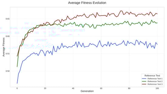 Average fitness evolution over 100 generations for three different reference texts using the optimal GA configuration.
