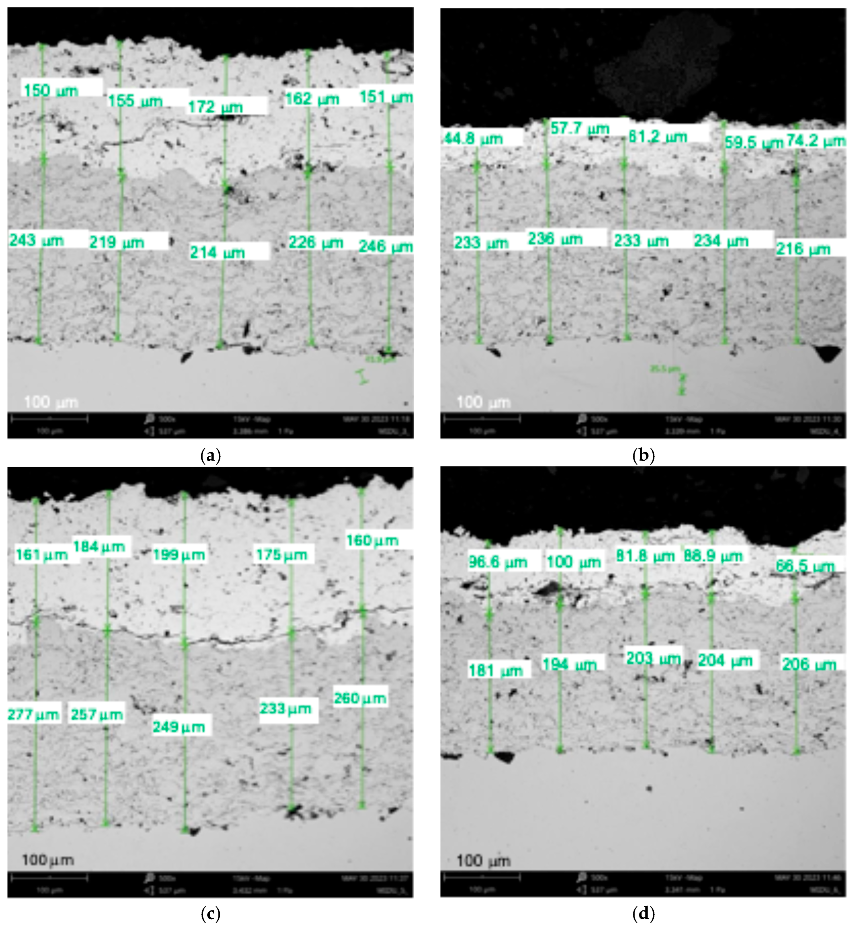 - Cabral-Miramontes, J.; Gaona-Tiburcio, C.; Maldonado-Bandala, E.; Vera Cervantes, D.; Nieves-Mendoza, D.; Mendez-Ramirez, C.T.; Lara-Banda, M.; Baltazar-Zamora, M.A.; Olguin-Coca, J.; Almeraya-Calderon, F. Comparative method between eddy current and optical microscopy in the determination of thickness of 6063 aluminum alloy anodization. Appl. Sci. 2025, 15, 9025. [Google Scholar] [CrossRef]