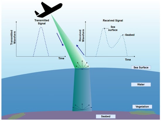 Recent technological advances in remote sensing have enhanced the potential for detailed underwater mapping. Among these technologies, Airborne LiDAR Bathymetry (ALB) has emerged as a powerful tool for surveying shallow and coastal waters [4,5]. Bathymetric LiDAR systems can measure depths up to 50 m (under perfect conditions) below the water surface, mapping the environment in the form of a dense point cloud [6]. As shown in Figure 1, ALB emits green laser light (typically at 532 nm), which is capable of penetrating the water column, capturing dense, high-resolution waveform data that reflect interactions with the sea surface, vegetation, and seabed structures. However, the immense volume and complexity of ALB waveform data represent significant challenges for automatic analysis. Each laser pulse generates thousands of intensity samples, which must be interpreted to distinguish different underwater targets, a process that remains largely dependent on manual or semi-automated methods.