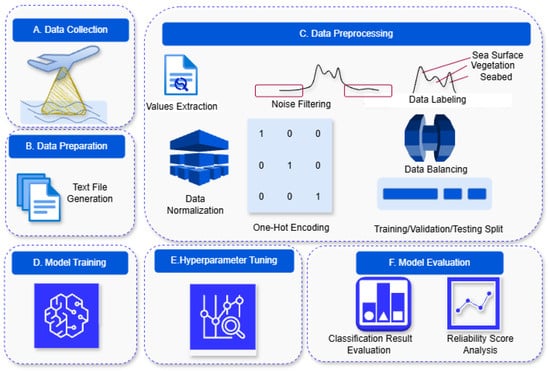 To classify bathymetric LiDAR data into five classes—sea surface, vegetation, seabed, water, and noise—a generic solution was developed, as illustrated in Figure 2. The process began with data collection, where two datasets were gathered. This was followed by a comprehensive workflow that included data preparation and a data preprocessing pipeline applied to both datasets. The data was then split into training, validation, and testing datasets. Subsequently, two deep learning models were trained, and the hyperparameters were selected empirically based on preliminary experiments and validation performance. The following subsections describe each step in detail.