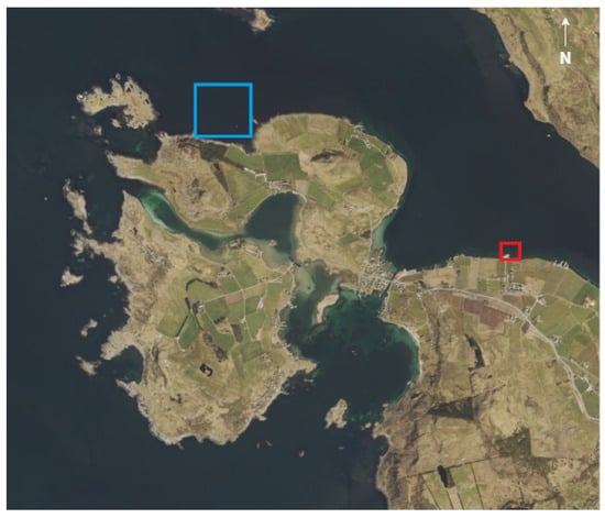 In the proposed solution, the first step was data collection, as illustrated in Figure 2. This study utilized two Bathymetric LiDAR waveform datasets, which will be referred as Dataset 1 and Dataset 2. These datasets were collected by the Norwegian Mapping Authority (Kartverket) [22] and given to the author of this study. These datasets were collected from two test sites in a coastal area of Fjøløy Island, Norway. The map of the test area is shown in Figure 3, where the first dataset is marked in a blue rectangle and the second dataset is marked in a red rectangle. In the collected dataset, each waveform consisted of 960 discrete intensity samples representing the laser’s return, accompanied by metadata including geographic coordinates, sensor position, and time stamps. These waveforms formed the raw input for the classification task.