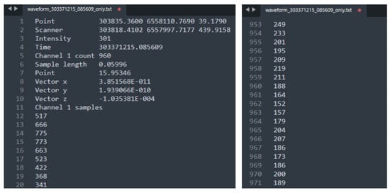 The excerpt of a text file from Dataset 1, ‘waveform_303371215_085609_only.txt’, is shown in Figure 4. The text file contains several fields describing the recorded waveform data. The field “Point” represents the first three values corresponding to the Cartesian coordinates of the reflecting point—east, north, and height. The second field, “Scanner”, lists the next three values (line 2), which describe the position of the scanner during data capture, specified by its coordinates (X, Y, Z). The “Intensity” field indicates the strength of the laser return for the given point (in this case, 301). The “Time (absolute GPS time, unit: sec)” field denotes the timestamp when the data was captured. The “Channel 1 Count” (here = 960) specifies the number of returns detected for Channel 1. The “Sample Length” field represents the time interval between consecutive sample points. The “Point” value indicates the elapsed time (in seconds) from the first recorded intensity sample to the return point within the waveform. The “Vector Information” field (lines 8–10) lists three values corresponding to the directional components (X, Y, Z) of the return vector. Finally, the “Channel 1 Samples” field contains a sequence of numeric values representing the intensity samples from Channel 1. Each file includes 960 intensity samples.