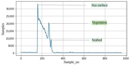 The intensity values shown in the Text File ‘waveform_303371215_085609_only.txt’ are presented in the graphical form in Figure 5 for better illustration. Here, the x-axis represents the sample number (960 samples), while the y-axis represents the intensity values. In the figure, it can be seen that there are 3 visible peaks, which correspond to three key features that are depicted by the laser. The first peak value was considered as the sea surface, the second peak value was considered as vegetation, and the final peak value was considered as the seabed.