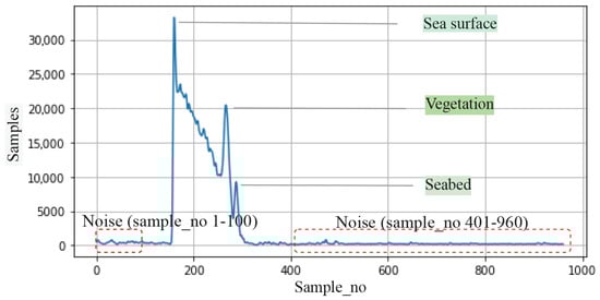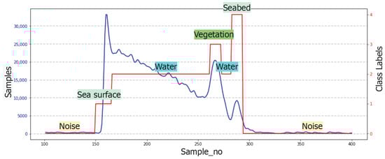 Although global noise outside the 101–400 sample window was removed in the previous preprocessing step, small irregular fluctuations may still occur inside the clipped region. These samples do not correspond to any physical return (sea surface, water, vegetation, or seabed) and are therefore labeled as ‘Noise’ (Class 0) to capture residual non-physical variations within the valid waveform segment.
